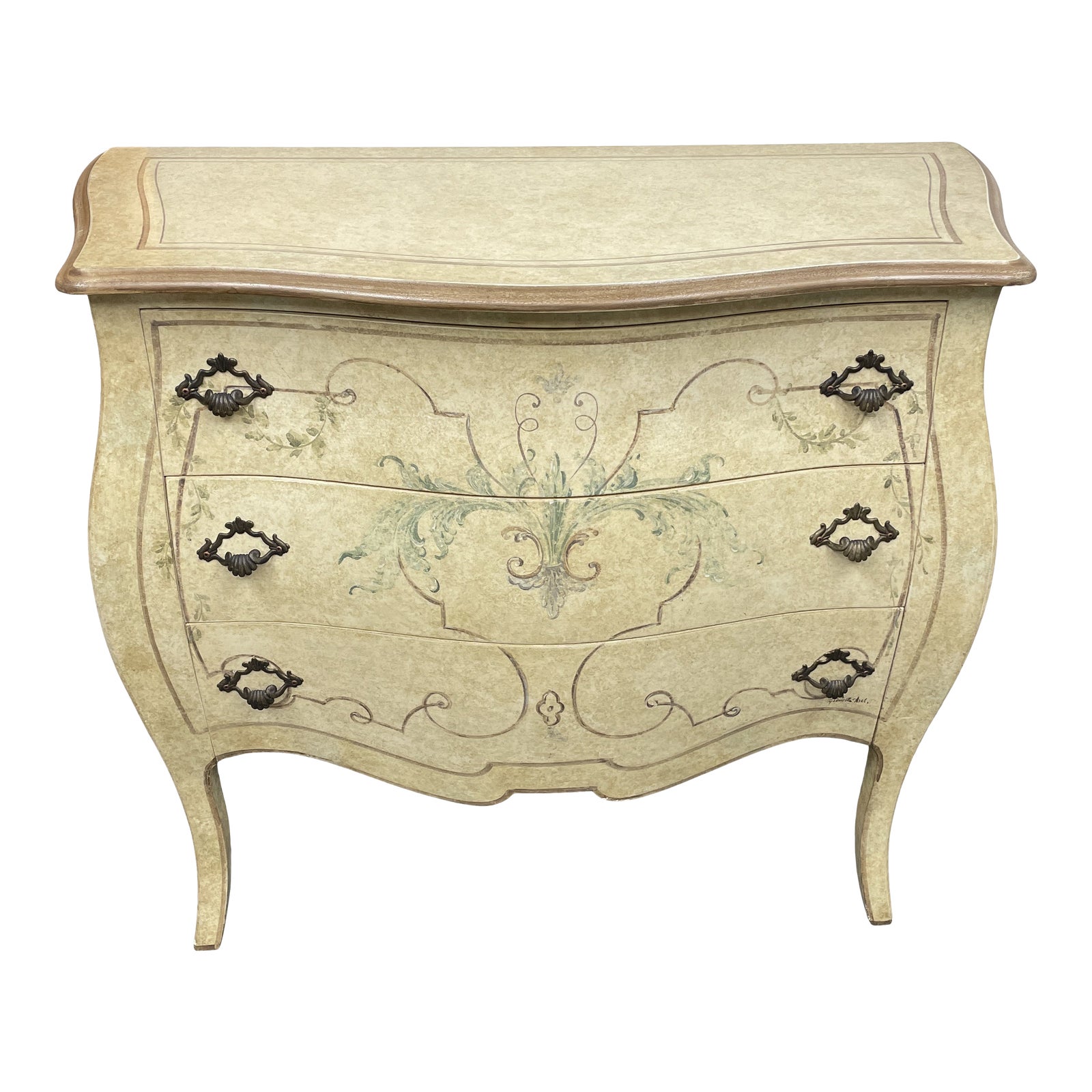 Design Plus Gallery presents a Decorative Crafts Hand Painted Three Drawer Chest of Drawers. Bring on the French Provincial + Shabby Chic vibes here with the faux finish hand painted bombe frame. Lovely curvature, airy base and thoughtful details makes the small scale of this unit even better for fitting into niches or tiny rooms. Oiled brass hardware contrasts beautifully against the light and warm palette. Pick up the foliage of you exterior with the light green painting. Minor wear through out, chest of drawers is in good condition. Signed by the artist on the lower right corner of the bottom drawer.