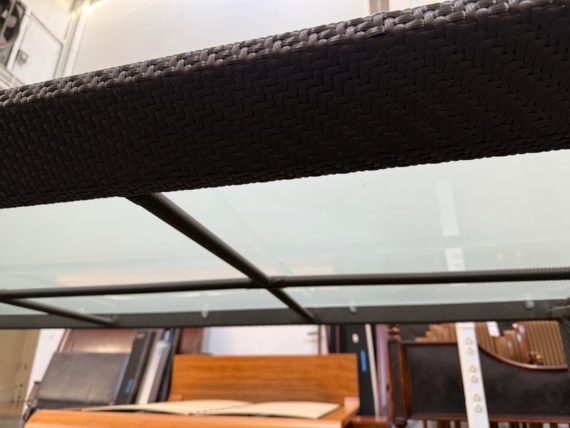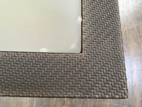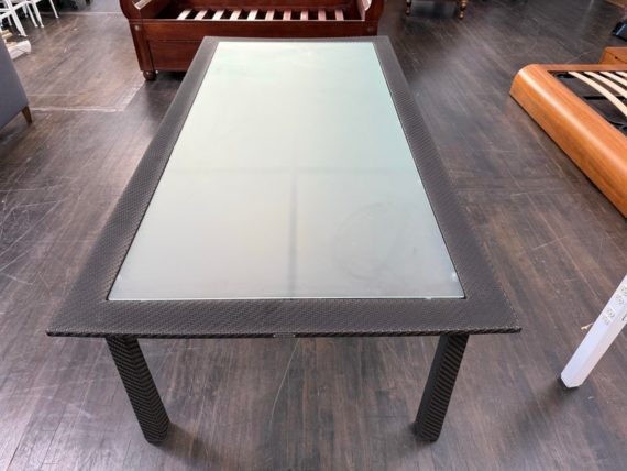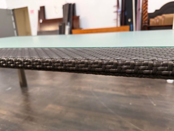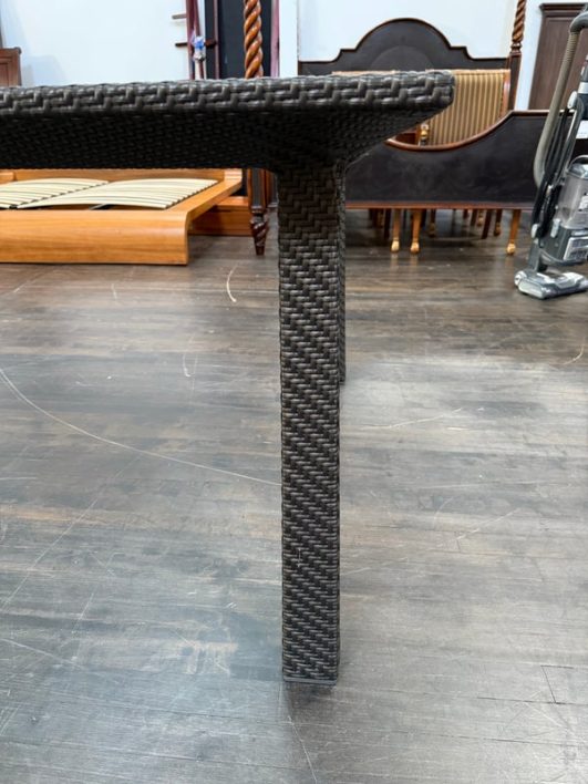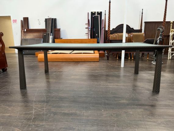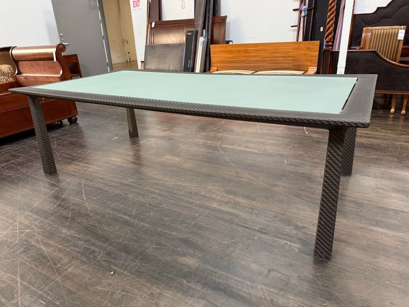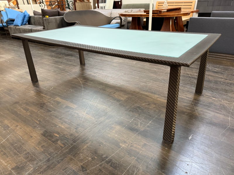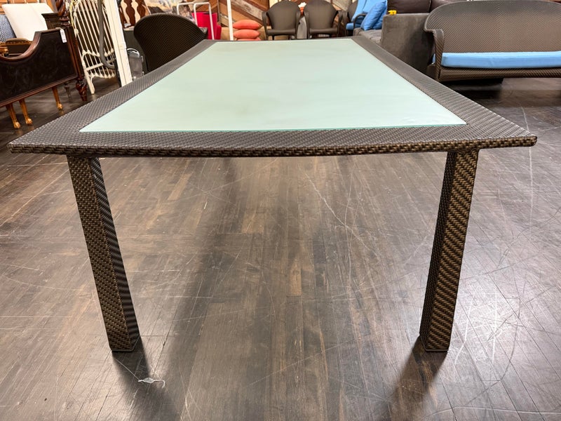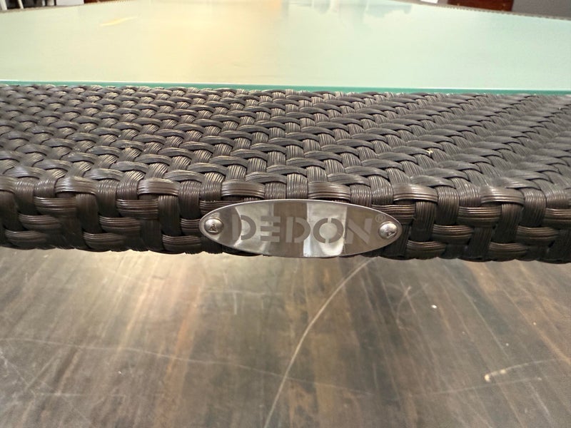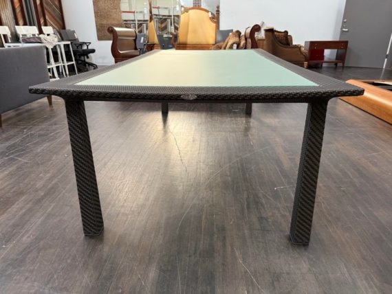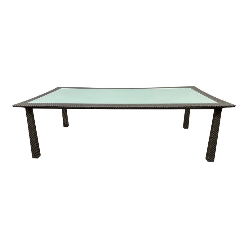 Design Plus Gallery presents a Rattan Woven Dining Table by Dedon. The tempered glass is inset with the woven rattan frame with thick legs that bow outward. The table is perfect for outdoors with its weight and durable materials, you will enjoy the great outdoors year after year. In good condition, visible and minimal wear from usage + age.