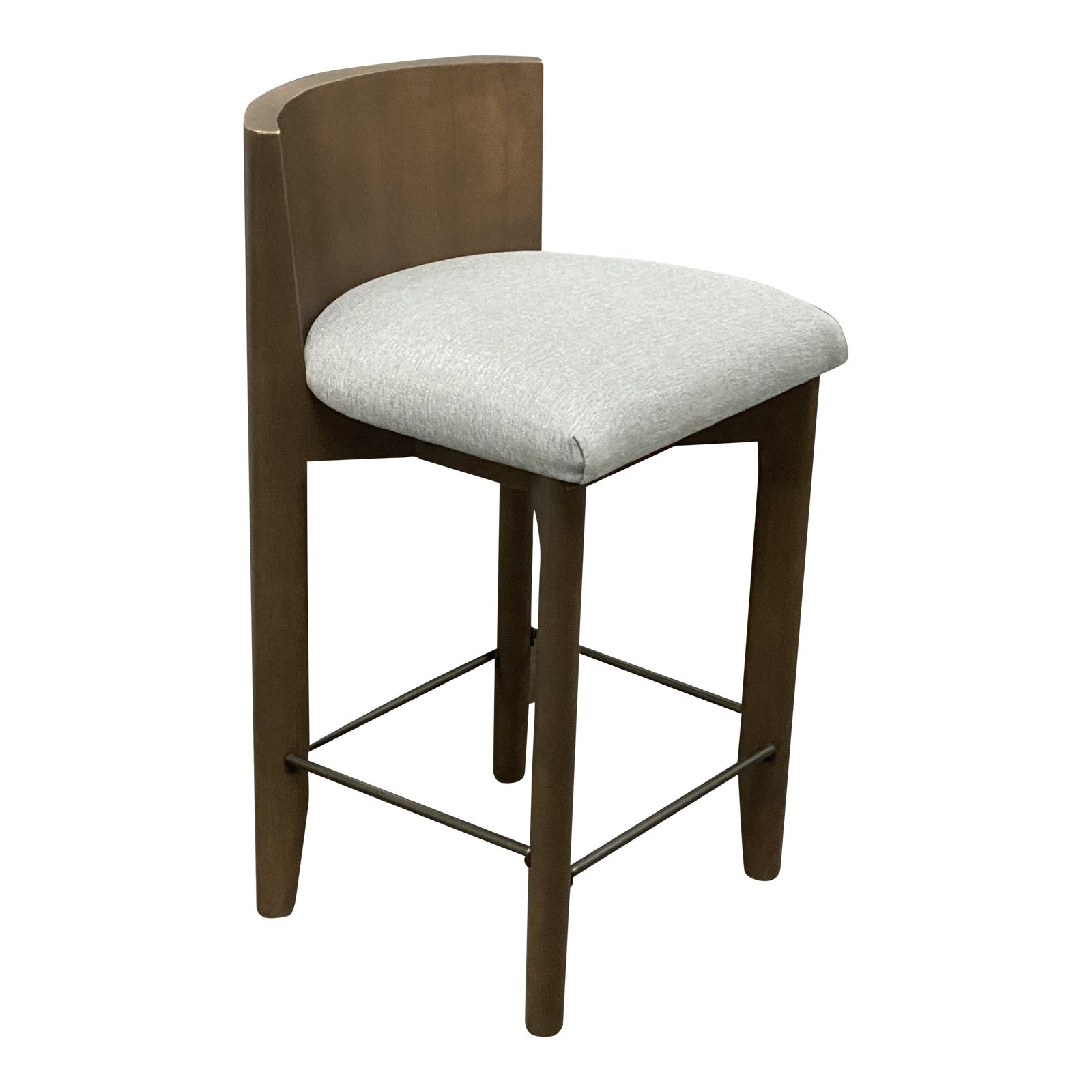 Design Plus Gallery presents a Delancey Counter Stool. The Delancey features a sculptural frame with an upholstered seat. The solid ash frame has an oil-rubbed finish that contrasts the rich creamy texture of the upholstery. The Delancey also features a tapered leg for a modern, minimalist look that is sure to enhance any living space. Minor wear and cracking. Made in North Carolina, USA.