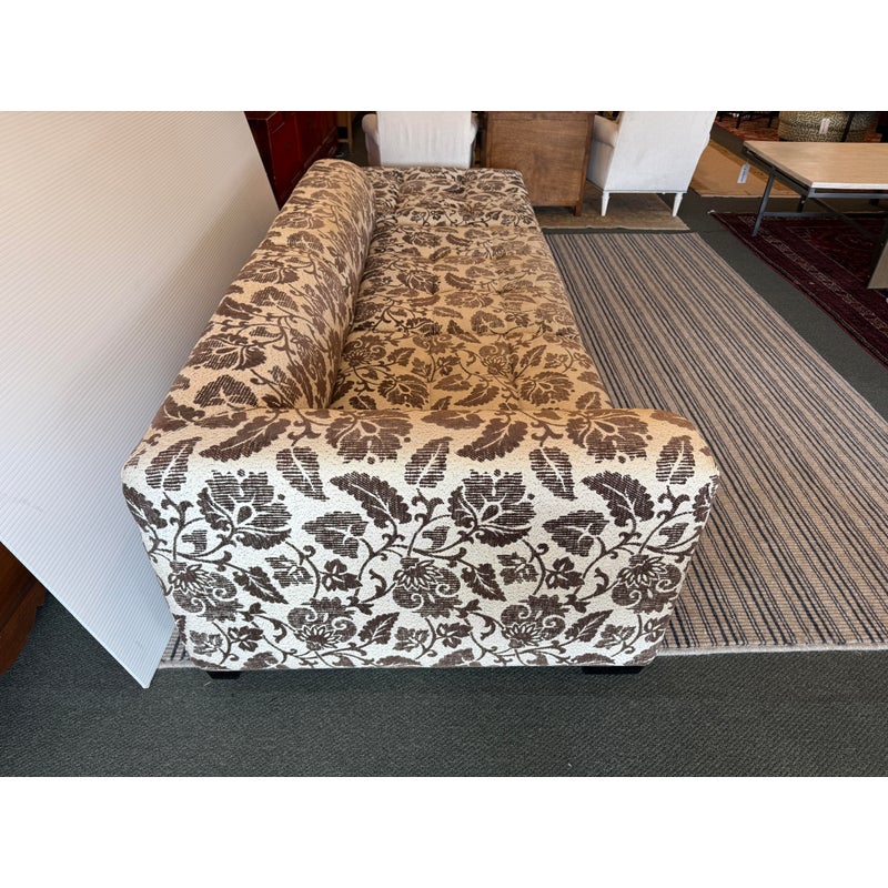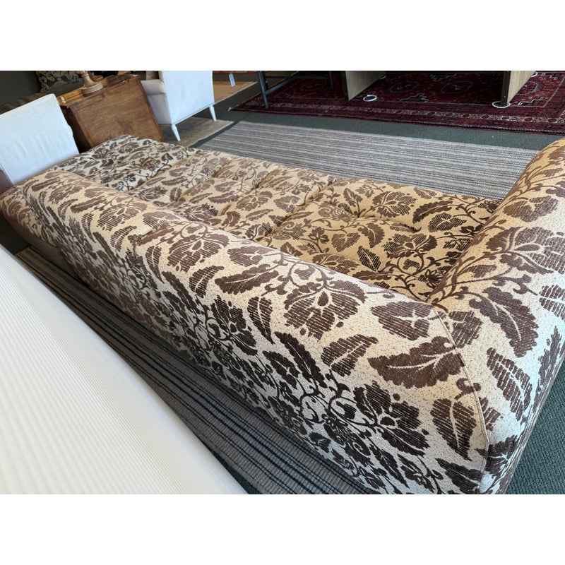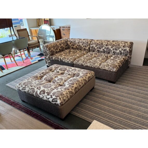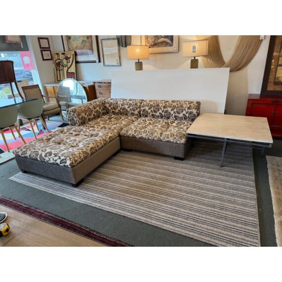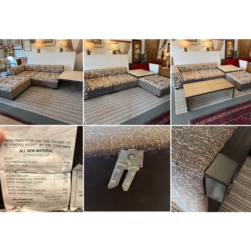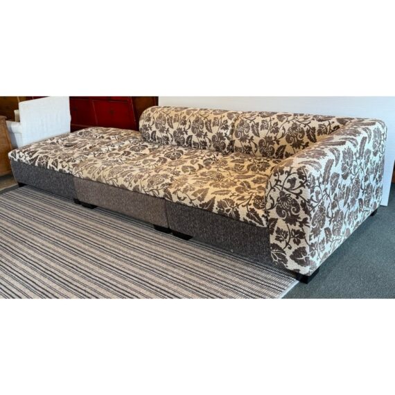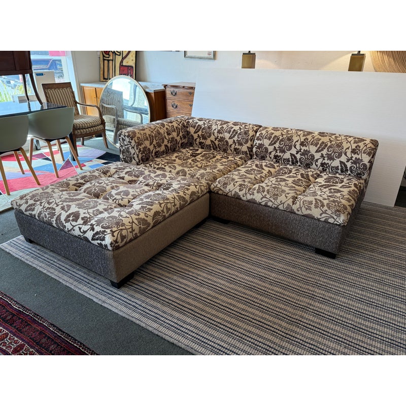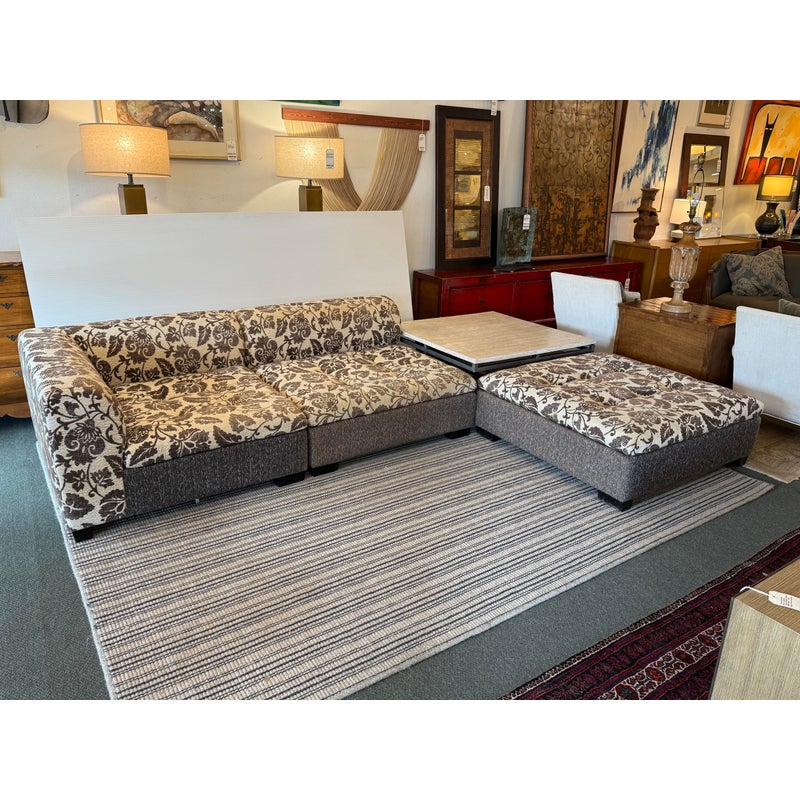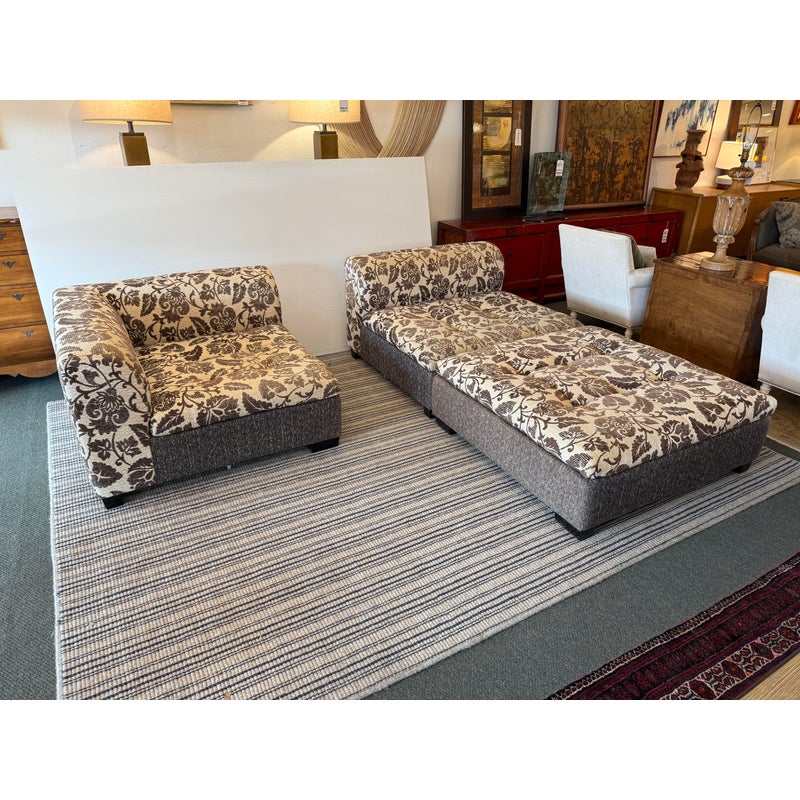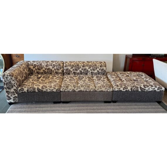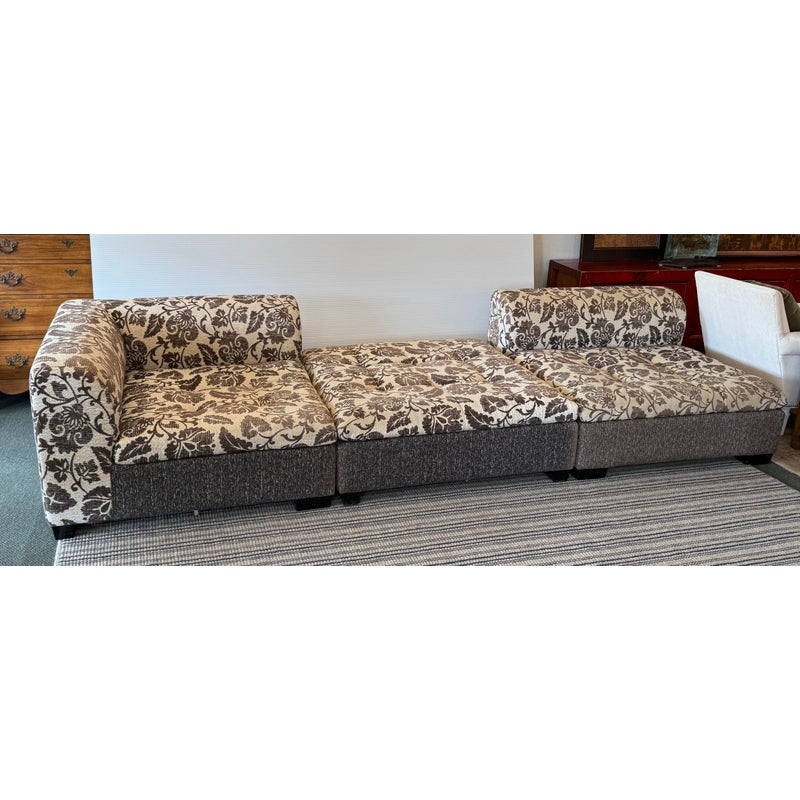 Design Plus Gallery presents the Fleur de Lis Sectional by Della Robbia. Three deeply cushioned and tufted segments can be organized in several ways to fit your room & lifestyle. Taupe and ivory large scale woven upholstery wraps the arms and seat, a complementary tweed (with flecks of gray) cover the bases. All are elevated on low block feet. Upholstery fabric has varying degrees of sun damage (shown); condition is fair for age and use. Made in the USA