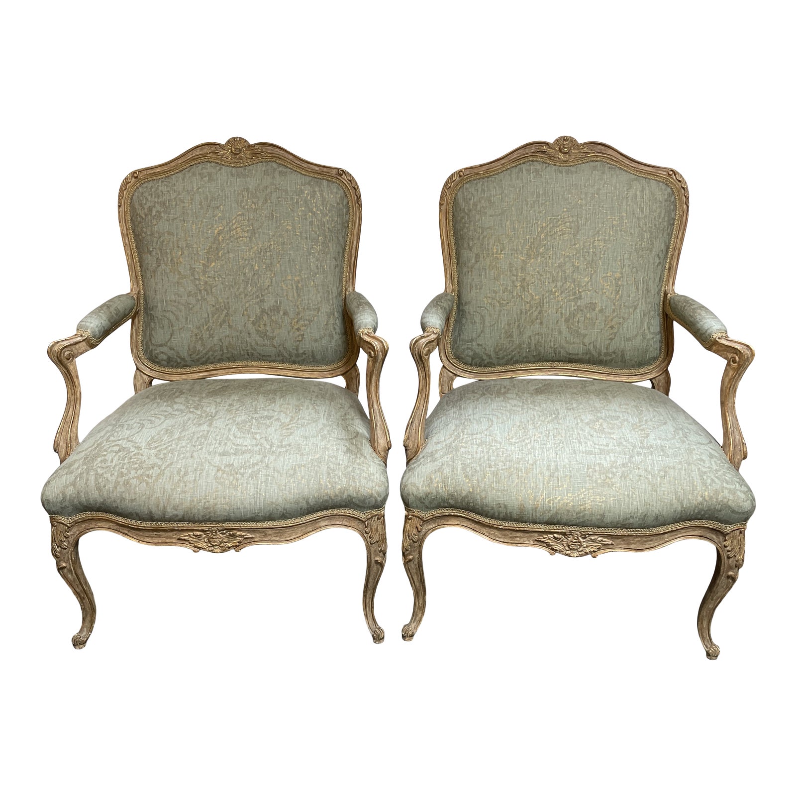 Design Plus Gallery presents a pair of Harcourt Fauteuil Arm Chaisr by Dennis & Leen. Beautifully customized with Rose Cummings Bird of Paradise jacquard in a glowing turquoise and gold weave, trimmed in gold braid. The hand carved wood frame has been antique washed with a touch of gold to highlight every intricate detail. Minor wear and markings. Elegant Glamour side by side.
