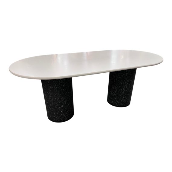 Design Plus Gallery presents the Confetti Dining Table. With its classic pill-shaped top and double pedestal base, the Confetti table is perfect for gatherings or meetings. The Confetti range celebrates the beauty and individuality of 100% recycled plastic in a vibrant collection that balances refined forms with bold textures. Black speckled bases with white laminate table top. These pedestals have containers with sand for stability. Visible scratches on surface.