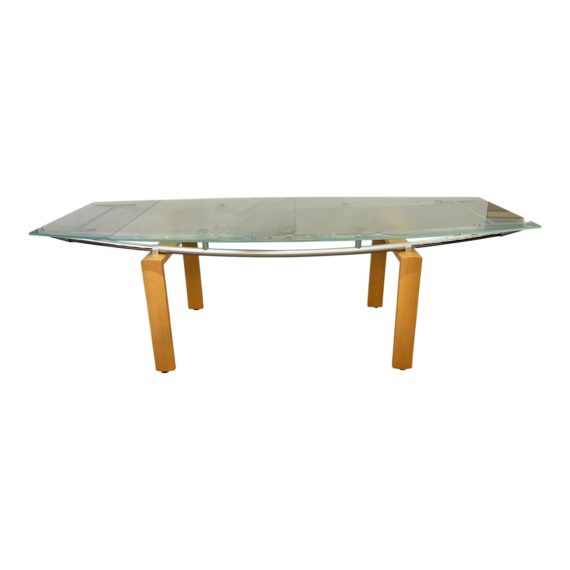 Design Plus Gallery presents an Extension Dining Table by Design Centro Italia. Braced with natural maple modern legs and secured on chrome posts, the surfboard shape glass extends 16″ at each end taking the length from 63 to 94.5″. A brushed steel rod swoops along each long side for visual interest and structural strength.