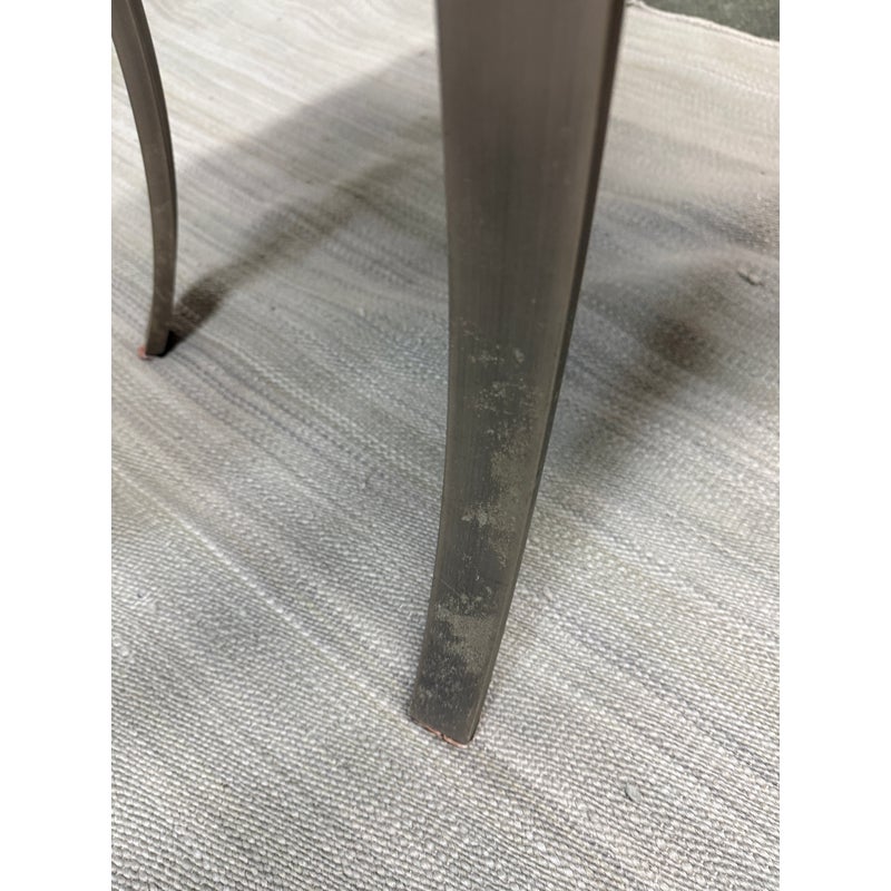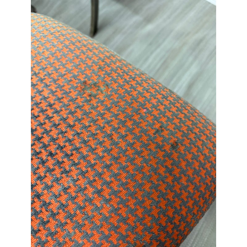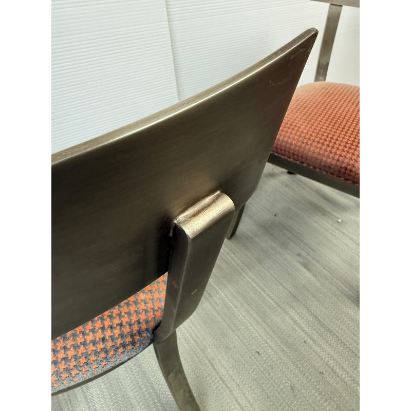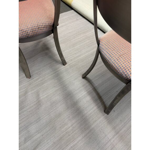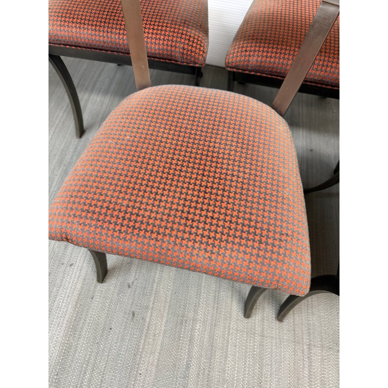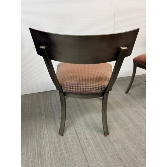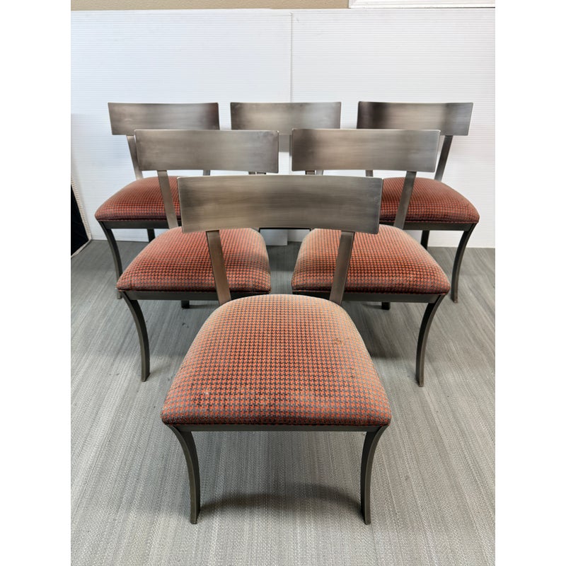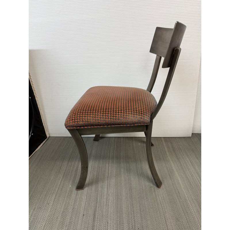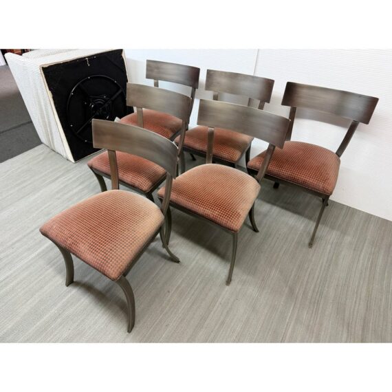 Design Plus Gallery presents a Set of Six Klismos Style Dining Side Chairs from Design Institute of America. The klismos chair is an iconic ancient Greek design, known for its elegant, light appearance and comfortable, body-cradling curves. The chair has splayed, curved legs and a wide, concave backrest that supports the sitter’s shoulders. The design was popularized in the 5th century BCE and has been frequently revived in various design movements, from Neoclassical to modern. The medium brown wood frame has a complimentary rose pink upholstered seat with a repeating houndstooth pattern of gray. There is wear the seats from regulars usage and finish conditions on the back of the chairs. They are considered to still be in good condition.