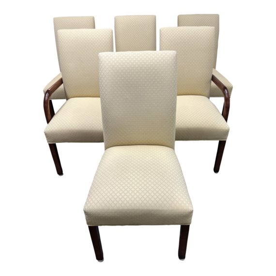 Design Plus Gallery presents a Set of Six Dining Chairs by DesignMaster Furniture. They have an elegant sateen finish to the upholstery that has a diamond like pattern. The frame offers a rich cherry finish on all the legs and two of armchairs. The conditions show wear that would be considered consistent with age + use.