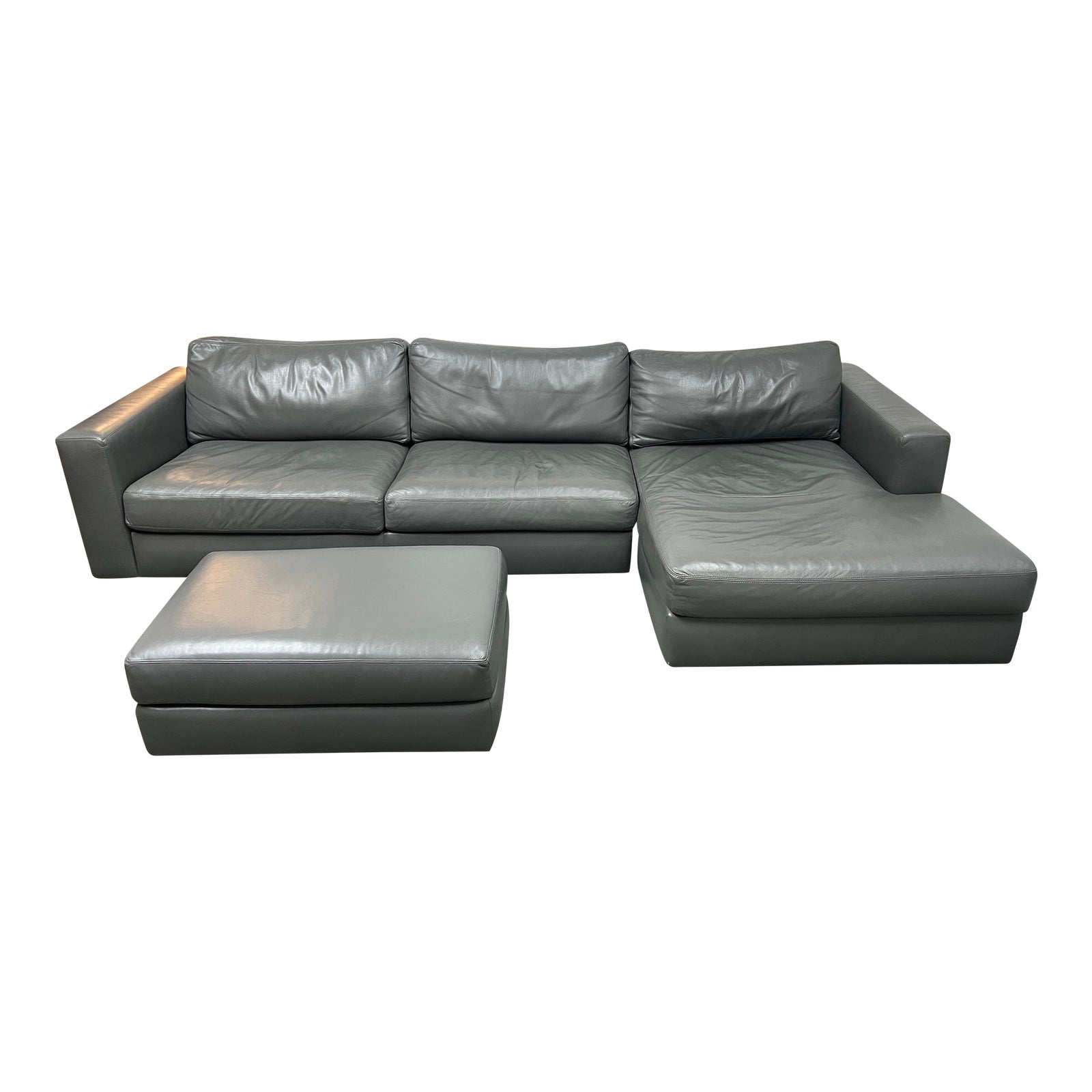 Design Plus Gallery presents a Reid Sectional + Ottoman by Design Within Design. Manufactured by American Leather. Designed in 2007 by Jeffrey Bernett and Nicholas Dodziuk for the Reid Collection. Features a right arm sofa + left arm chairs. A plush, sink-right-in support, thanks to down-and feather-wrapped foam cushions and down- and feather-filled back cushions. Supportive foam seat cushions wrapped in Featherblend fill. Plush back cushions filled with a blend of down and feathers. Upholstered in a gray leather. Accompanied with an ottoman. Minor wear from usage.