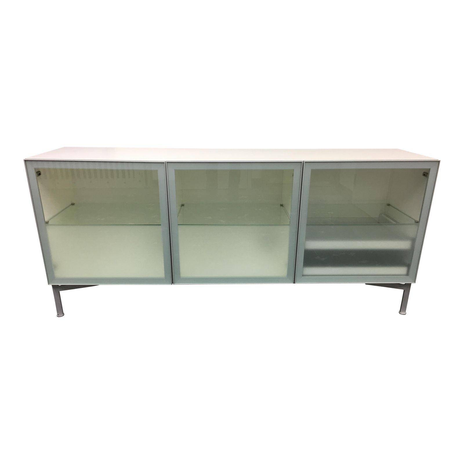 Design Plus Gallery has an Alto media credenza . The piece is White with glass doors. The cabinet is divided into three equal parts , each with its own glass door. The glass doors are sandblasted half way up each door. The doors are trimmed in Aluminum . Each section has a glass shelf which divides each cupboard into two equal parts. The two sections on the left are fairly open for ample storage however the one on the far left has two pullout trays for easy access. This piece could also be used in the dining room successfully!