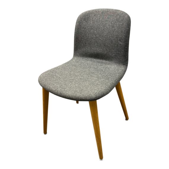 Design Plus Gallery presents a Bacco Chair from Design Within Reach. The Bacco were the first of the collection to be imagined, designed and built. It is the archetype of the collection, from which the concept of comfort that is reflected in each Bacco starts: the 3D shape welcomes the body giving support, with the right proportions. The numerous and transversal projects including the Bacco chair, the bars, restaurants, dining rooms, hotel rooms are the continuous assurance of a product built to last over time and which has become one of the modern classic pieces of interior design. Available here in a signature gray boucle fabric with honey gold wood frame. Has some surface conditions that are consistent with the age + use. Visible and minor stains. Made in Italy.