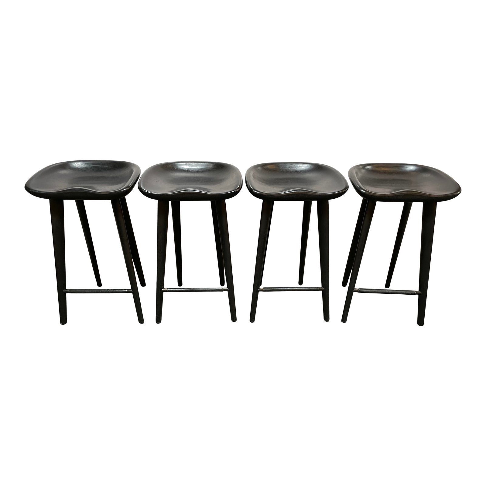 Design Plus Galley presents a Set of Four Tractor Counter Stools by BassamFellows. Debuting at the Milan furniture fair in 2003, the BassamFellows Tractor Stool has since become a modern (often duplicated) icon that exudes timelessness and ineffable contemporary cool. Combining architectural precision with the honest, humanistic character of the handmade, the Tractor Stool embodies the BassamFellows ‘Craftsman Modern’ lifestyle vision, an organic s shape influenced by the precise ergonomics of a Swiss tractor seat. Carved from a piece of sustainably and locally harvested solid wood using techniques it is hand-finished by expert cabinetmakers. Wear is consistent with use; items are in good condition. The stool is elegant yet informal, and supremely comfortable with dark-finished woodgrain that keeps each piece unique.