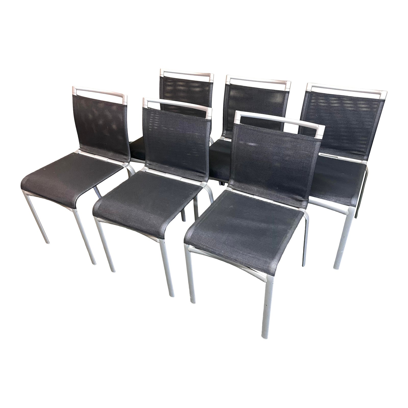 Design Plus Gallery presents a Set of Six Net Dining Chairs, from Bontempi Casa. Purchased from Design Within Reach. The set of indoor-outdoor stackable chairs are crafted with a light grey lacquered Metal frame, seat and back in black Texplast mesh. Timeless modern stying. Designed in Italy.