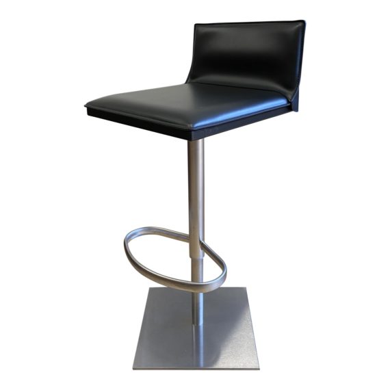 Design Plus Gallery presents a Single Bottega Black Adjustable Bar Stool from Design Within Reach. Stool turns 360 degrees with ease. Integrated hydraulic adjusts with the gas piston lift located underneath the seat. Integrated rounded footrest adjusts with seat. Bottega stool is wrapped in silky smooth stain-resistant leather and is hand sewn onto the slender but strong stainless steel frame to hug every angle and curve. Seat is lightly padded, minor wear on surfaces. Made in Italy.