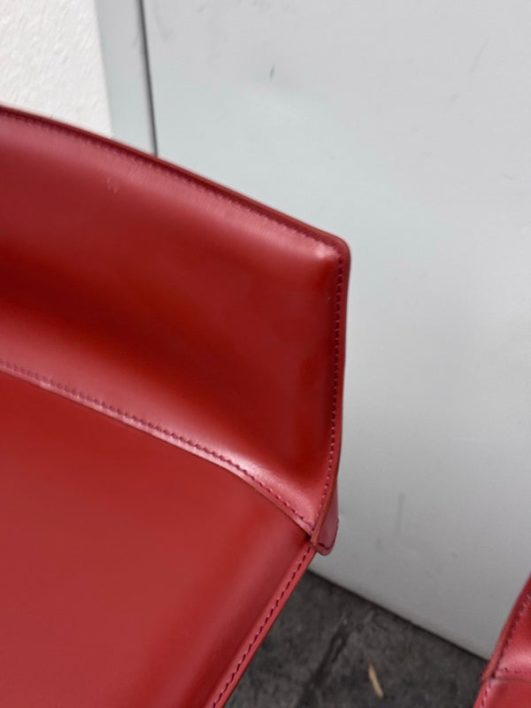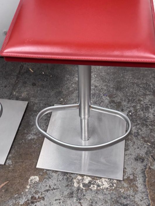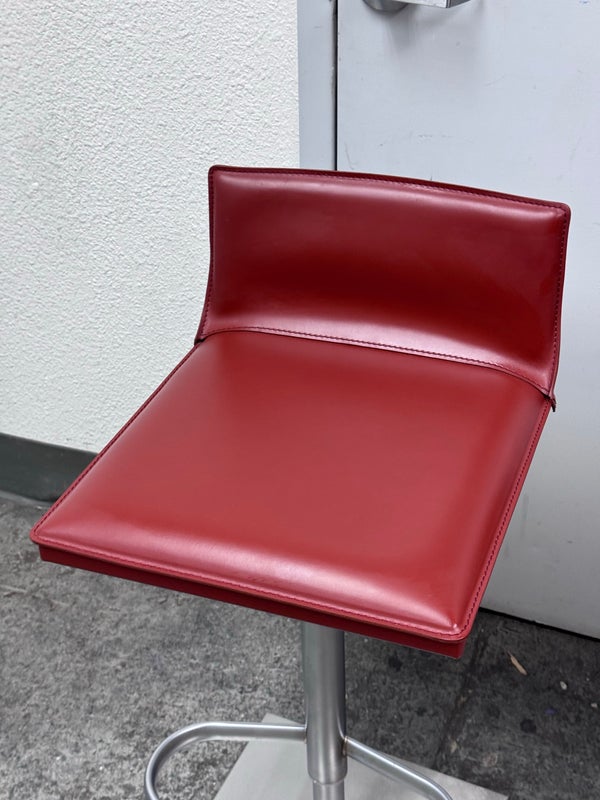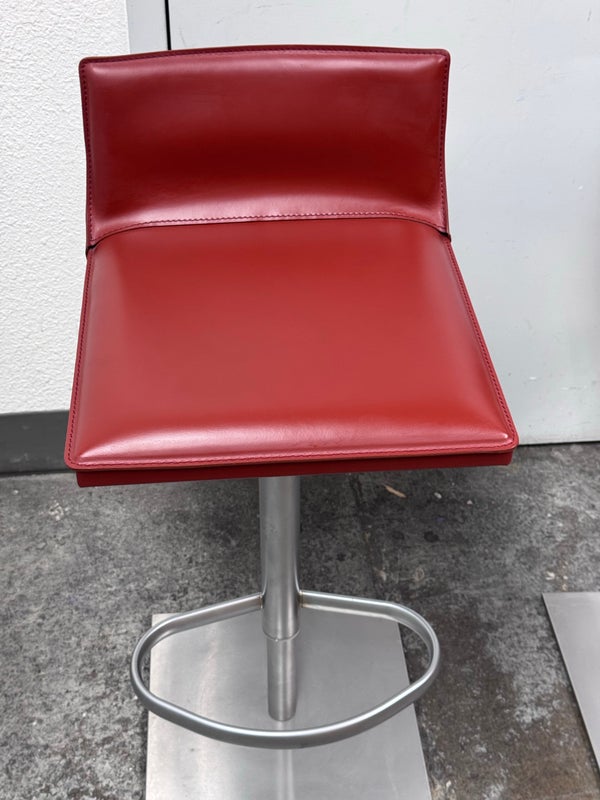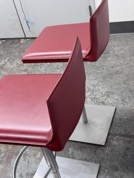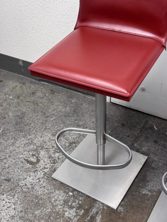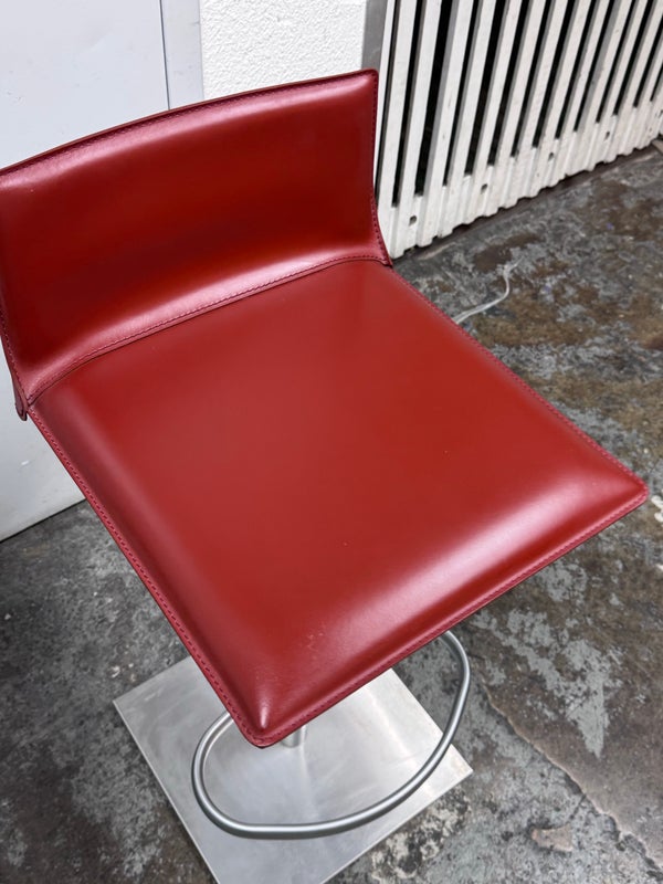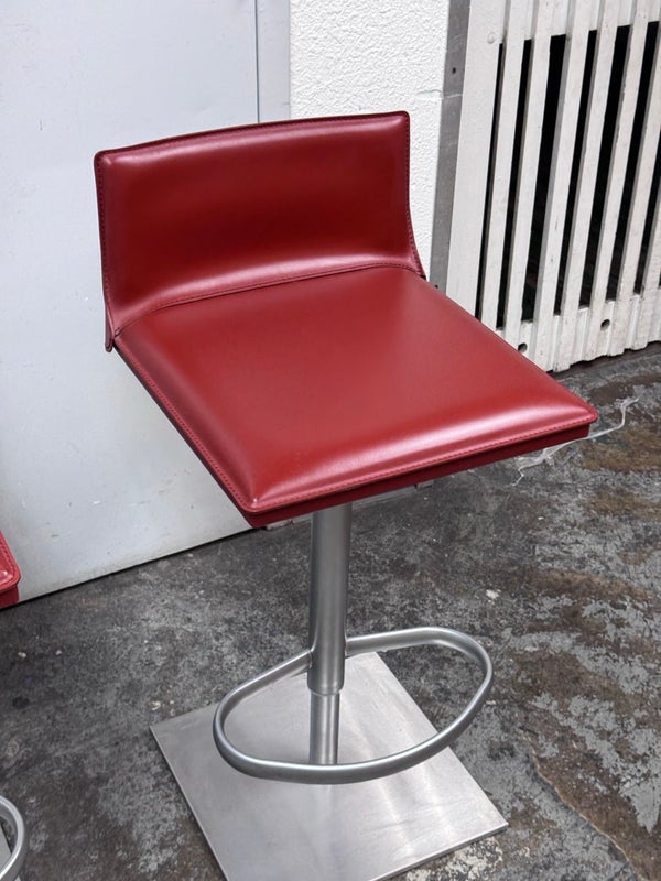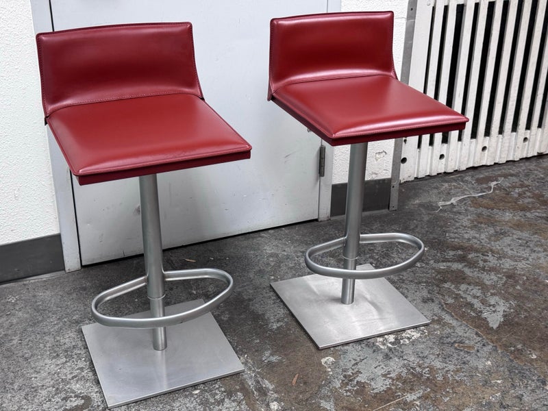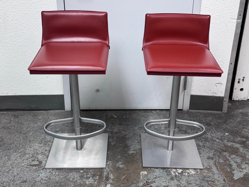 Design Plus Gallery presents a Pair of Bottega Piston Stools from Design Within Reach. The two stools are exceptionally designed and made in Italy. They swivel 360 degrees and instantly adjusts between counter height and bar height with the press of a lever that operates a gas cylinder. They have been wrapped in smooth-as-silk stain-resistant oxblood leather that’s hand-sewn onto the slender but strong steel frame to hug every angle and curve. The seat is lightly padded, creating a combination of suppleness and strength that’s not always easy to find. Both are in good condition for their usage with minimal visible wear.
