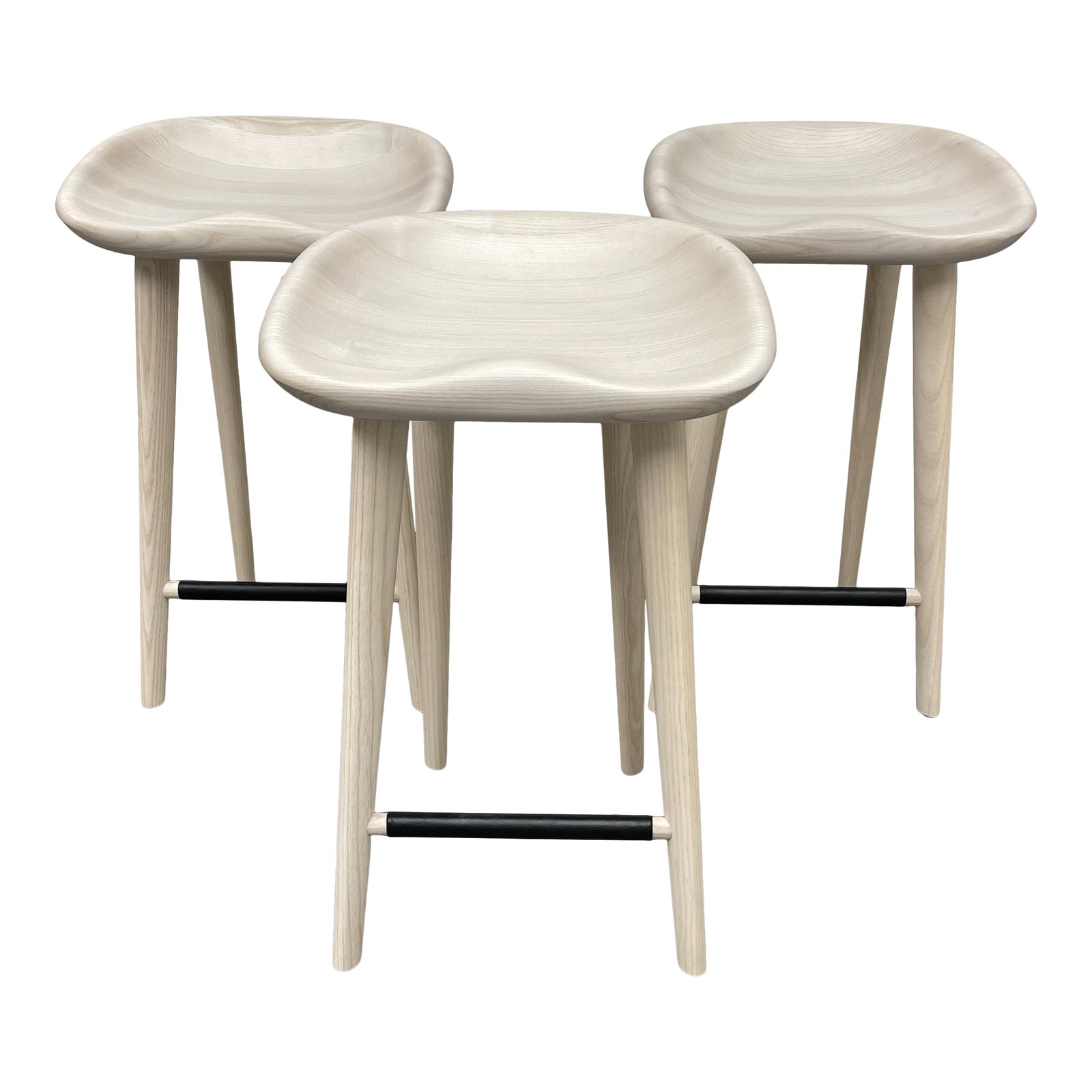 Design Plus Gallery presents a Set of Three Tractor Stools by Design Within Reach. Designed by Craig Bassam in 2000/2001, Bassam was working on a project in Switzerland when he found a tractor seat on the side of the road. Impressed by how the backless seat allowed him to sit in an upright, ergonomic position, he set out to make one in wood. The Tractor Stool is carved out of a block of sustainably sourced ash wood and hand finished. Because of the natural variations in wood, each one is unique and will develop a warm patina over time. Seat sculpted to accommodate sitter. Leather-wrapped footrest. Hand finished with a wipe-on oil and sealer product. Family-Friendly Description: Round edge and washable surface. Ash Finish versions made in Italy.