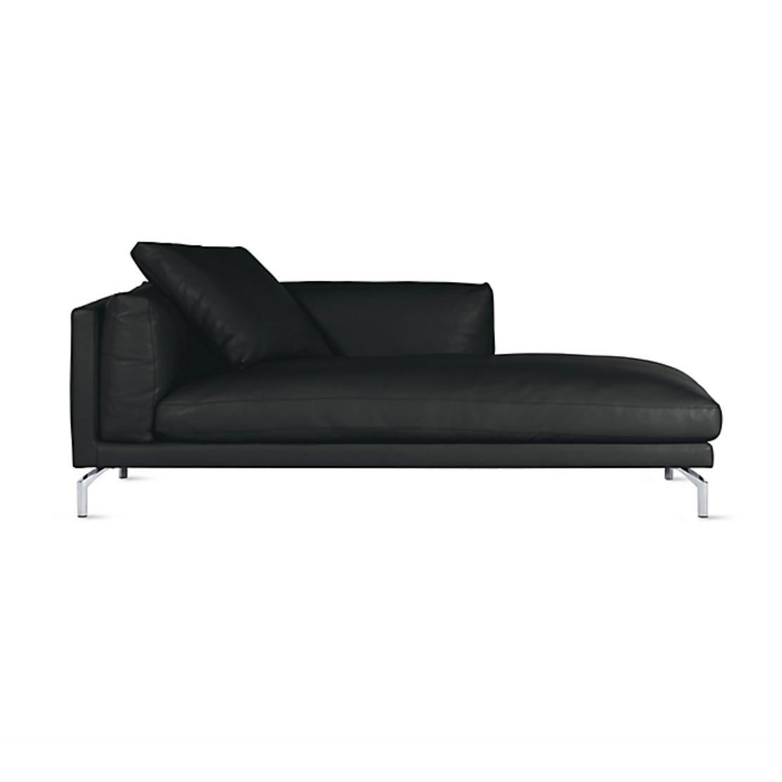 Design Plus Gallery presents an elegant Como Leather Chaise by Design Within Reach. Designed by Giorgio Soressi in 2007. The extremely well-constructed lounger is built with solid steel frames and cast-aluminum legs (shown in reversed position). Enveloped in soft black leather, the feather filled cushions feather filling and variable-density foam have firmer in front for support. Two leather throw pillows are included. Made in Italy.