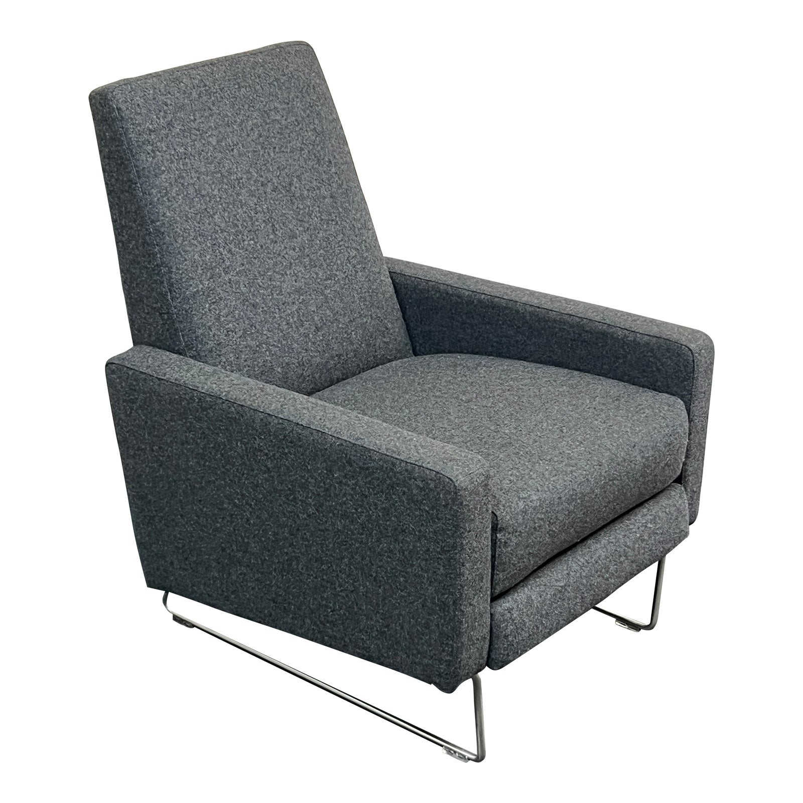 Design Plus Gallery presents a Flight Recliner by Design Within Reach. Designed by Jeffrey Bernett. This comfortable recliner was made with a clean silhouette and minimal seams in gray flannel upholstery for modern interpretation of a classic recliner, one that hides its function. A patented reclining mechanism provides a smooth, handle-free operation.The seat rests atop a stainless steel sled base.The Flight recliner is for DWR exclusively by American Leather, and made in the USA. Good structural condition, with light surface wear.