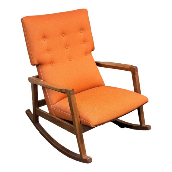 Design Plus Gallery presents the Risom Rocker designed by Jens Risom for Design Within Reach. The Risom Rocker (2009) is a wonderful Ducal Wool upholstered rocking chair with a high back and sculpted armrests for comfortable head and arm support. The smooth and balanced feeling can be attributed to a hidden counterweight hidden in the front rail. It has a mid-century nod with nine-button tufted back, a classic solid walnut Danish modern aesthetic that can be found in all his work. Little evidence of wear; condition is good for age and use. Made in U.S.A.