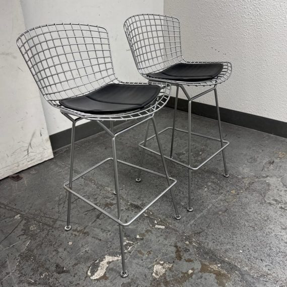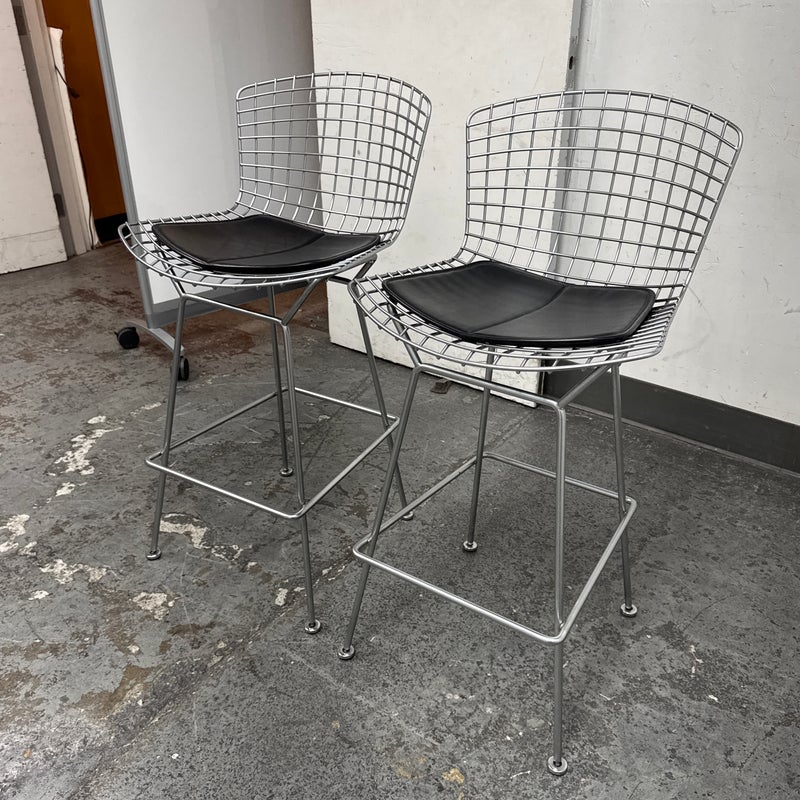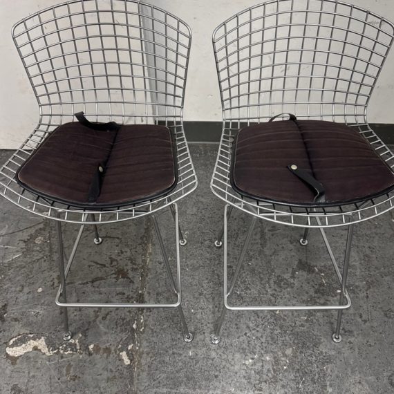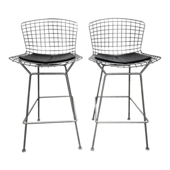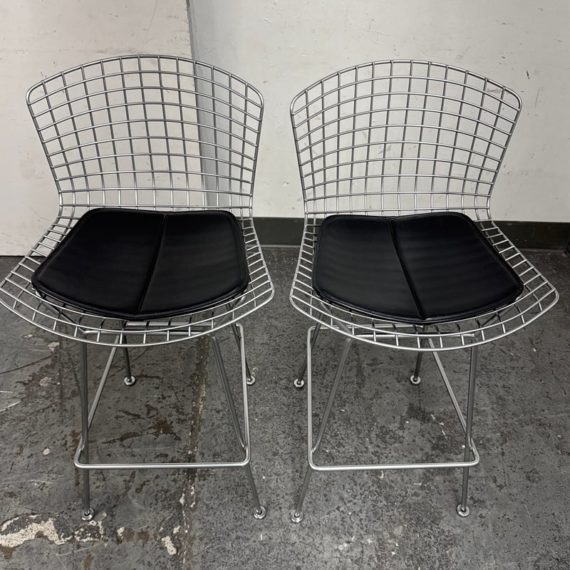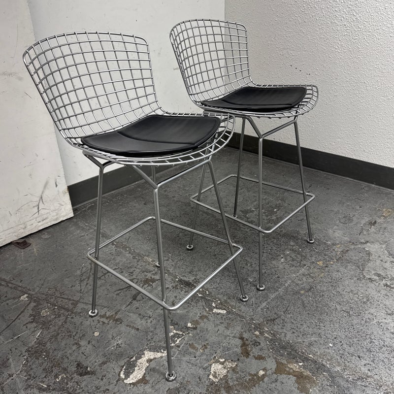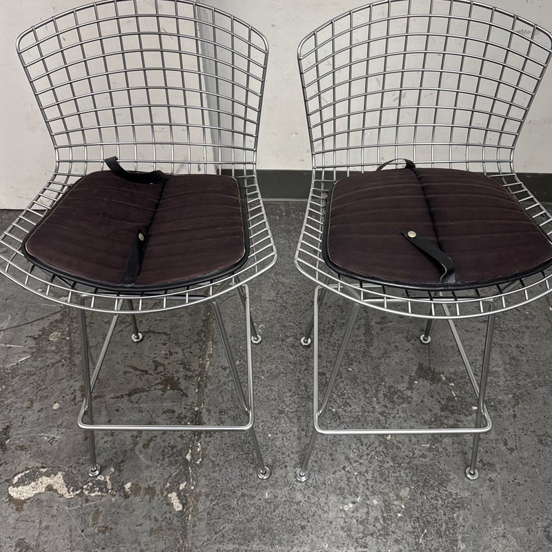 Design Plus Gallery presents a Pair of Bertoia Barstools. Designed by Harry Bertoia in 1952. The design remains quite relevant today. The seats and bases are constructed of chromed metal wire. The seat pads are a with black seat pads. The chrome frame has visible patina and rust on the frame and underneath the seat cushion. There is no makers stamp on the frame.