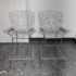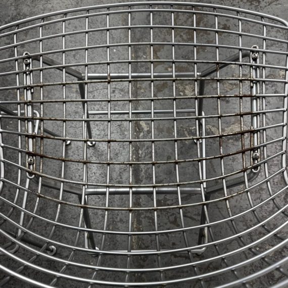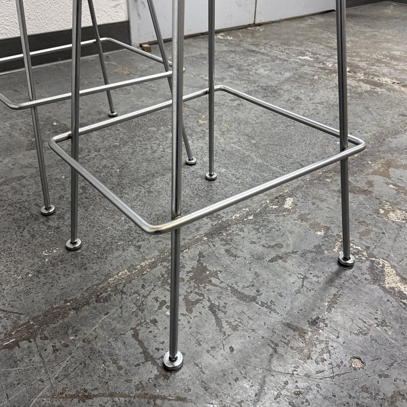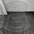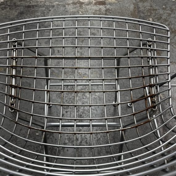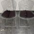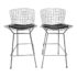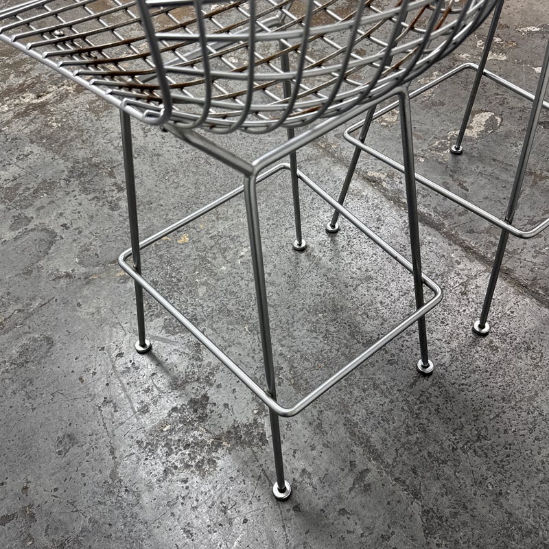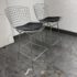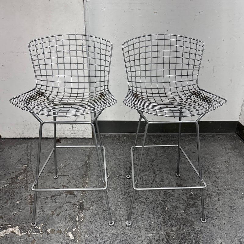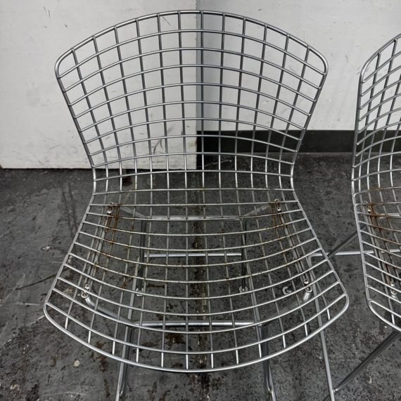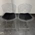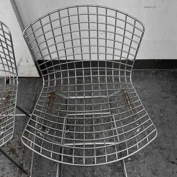 Design Plus Gallery presents a Pair of Bertoia Barstools. Designed by Harry Bertoia in 1952. The design remains quite relevant today. The seats and bases are constructed of chromed metal wire. The seat pads are a with black seat pads. The chrome frame has visible patina and rust on the frame and underneath the seat cushion. There is no makers stamp on the frame.