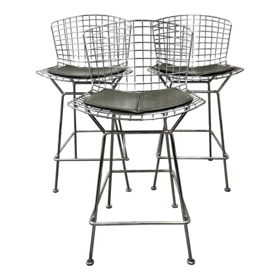 Design Plus Gallery presents a Set of Three Knoll Bertoia Counter Stools. Designed by Harry Bertoia in 1952. The stools are produced by Knoll for Design Within Reach. The design remains quite relevant today. The seats and bases are constructed of chromed metal wire. The seat pads are a with black seat pads, they have snaps to keep them in place. Made in Italy.