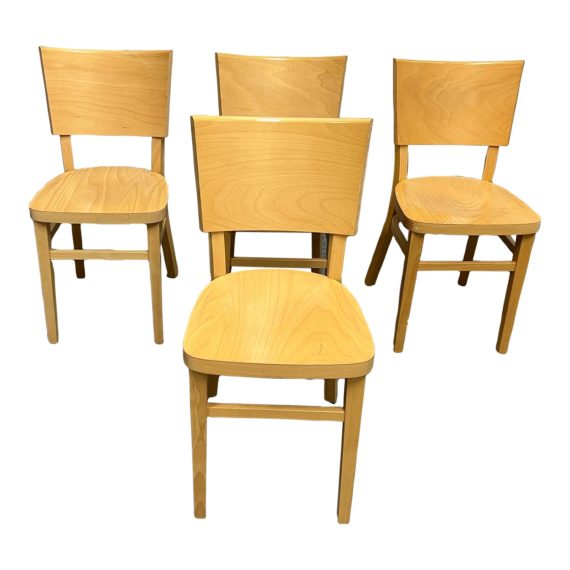 Design Plus Gallery presents a Set of Four Kyoto Dining Chairs by Design Within Reach. From the Kyoto Collection, favored among chic restaurants and bars for its enduring style and construction. Clean, minimal lines, richly grained wood and generous proportions combine in this elegantly versatile design for the home or business. Visible and minor from usage and age.