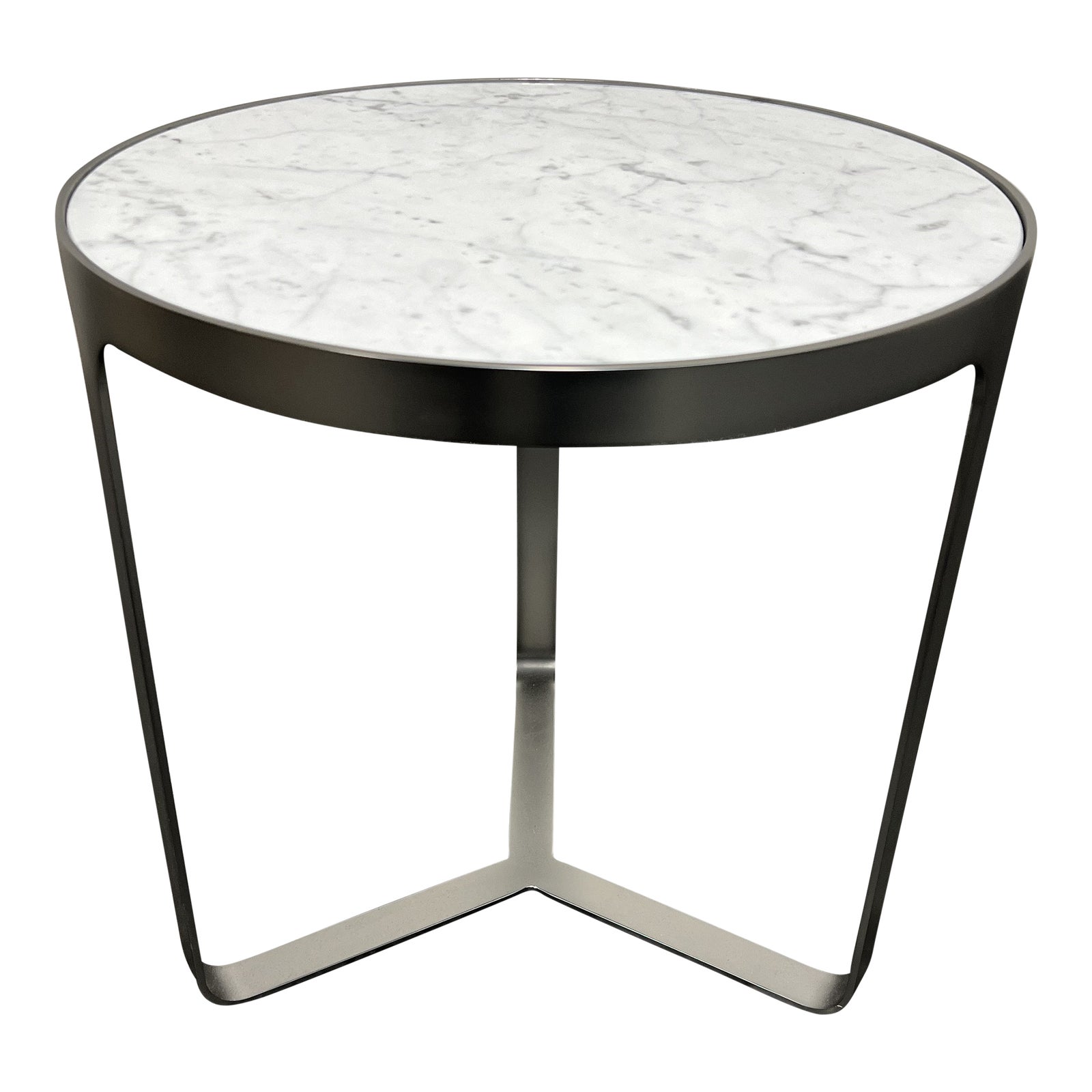 Design Plus Gallery presents a Marble Cage Side Table by Design Within Reach. The base is constructed with metal. It supports a round top created with Carrara marble. The base has three legs that are slim, rectangular, and connect in the center. Made in Italy. Minor wear consistent with use; table is in good condition.