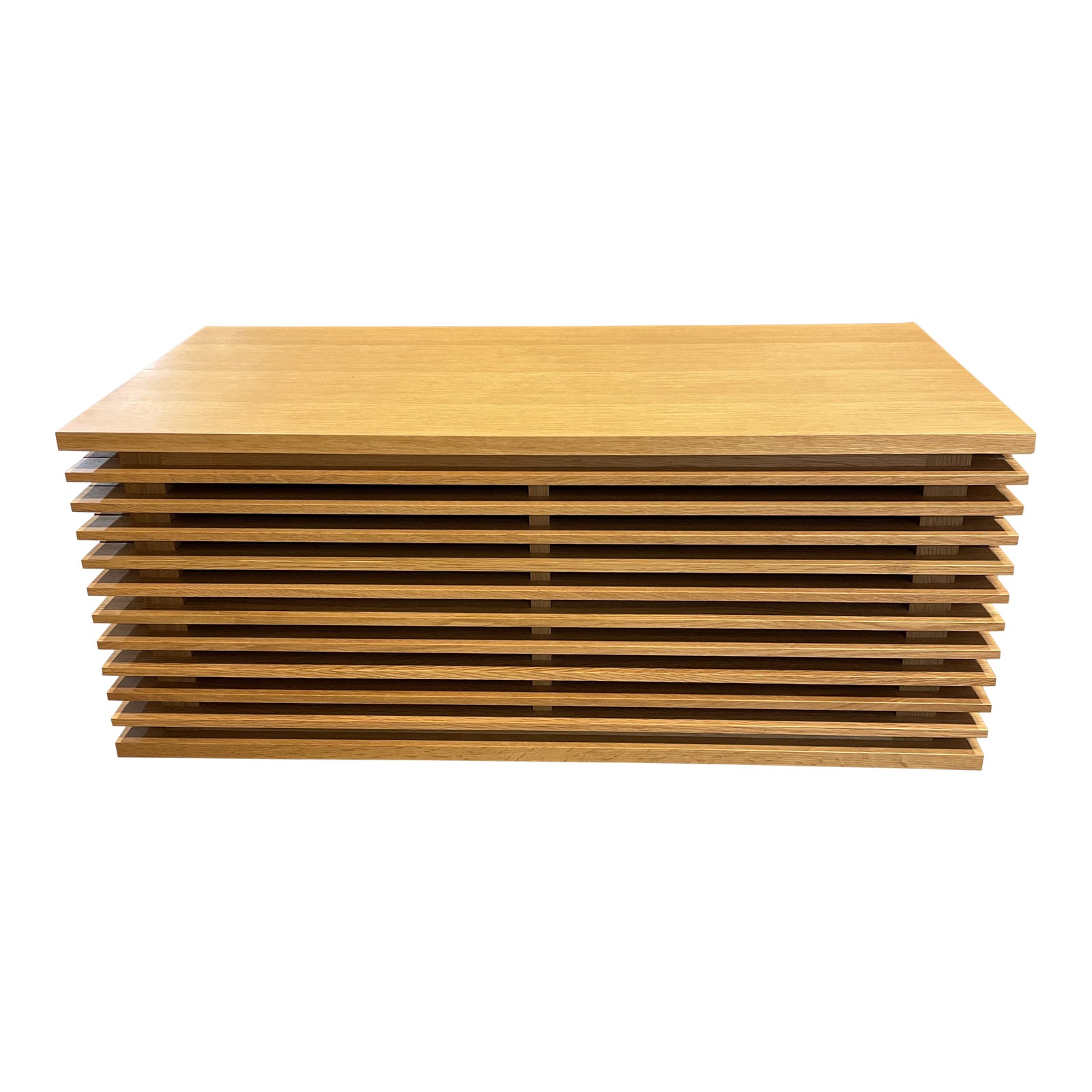 Design Plus Gallery presents a Line Media Console 35 by Design Within Reach. Designed by Nathan Yong in 2010. A versatile storage solution, features an eye-catching louvered design that also serves a purpose, allowing remotes to control devices inside. This unit has one door, one adjustable shelf and one cord escape in the bottom panel. Minor wear, small chipping on back corner. The finish is Oak. Made in Malaysia.