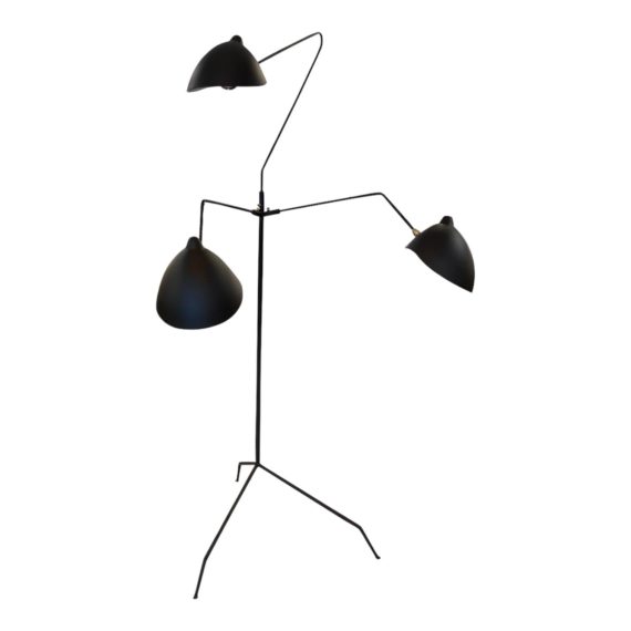 Design Plus Gallery presents Serge Mouille 3 Arm Black Floor Lamp. Originally designed in 1952, a kinetic, sculptural aesthetic that evokes a sense of movement in space. Consisting of an iron arm and tripod base, the main feature of this piece is the aluminium ‘chapeau’ (or ‘hat’) styled shade. The entire piece is coated in a black matte lacquer, with only the interior of the shade finished in white to maximize the bulb’s reflective qualities. Designed with the intention of supplying as much light as possible, this standing lamp would be a head turning centerpiece in any room. In good condition, minimal wear from usage + age.