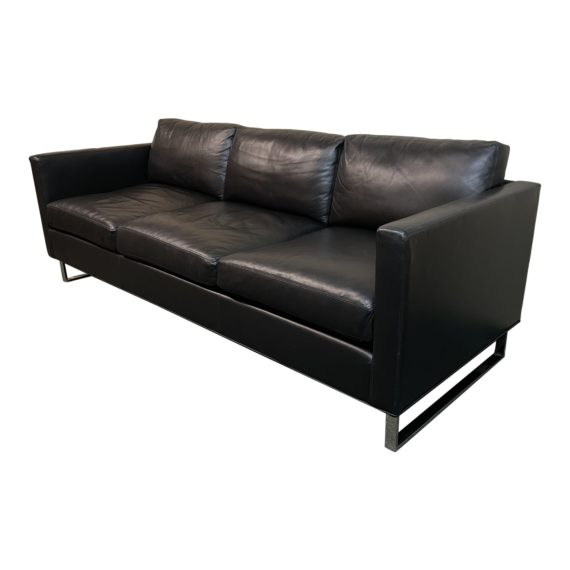 Design Plus Gallery presents the Tuxedo Sofa by Thayer Coggin for Design Within Reach. Luscious black leather wraps the Milo Baughman designed sofa, that is perched on a stainless steel base. Blending briilliant design and craftsmanship with superior comfort, the seating offers a deep seat and soft cushioning in loose back and seat cushions. The overall impression is stunning.