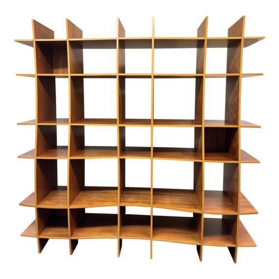 Design Plus Gallery presents the Wave Open Etagere by Design Within Reach. The face of the cherry shelving is uniquely crafted with an undulating form, that creates an artistic display for books and treasures. Pieces are designed to be flat packed separately and assemble easily like puzzle pieces. Bookcase includes three square backdrops which can interchange between the square openings, and provide support. There is light surface wear, bookcase is in good condition for age and use.