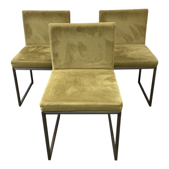 Design Plus Gallery presents a Set of Three Suffolk Chairs by Desiron. Hand Crafted, American-made Furniture. Stainless Steel frames welded by skilled artisans. The seat is upholstered in an olive green fabric. Visible and minor wear on fabric. The metal shows rust and will need proper restorations.