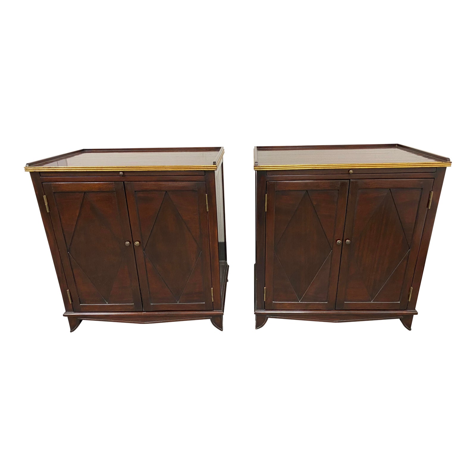 Design Plus Gallery presents a pair of Dessin Fournir Nightstands. Made in Los Angeles. Inspired by classical European design in both silhouette and execution. Dessin Fournir blends many periods and origins in a transitional and elevated contemporary fusion. These nightstands open to reveal an adjustable shelf on the interior with tongue and groove adjustments. Inlaid diamond pattern on the doors have the look of an antique with marquetry. Top surface is a dramatic tiger flame oak with a gold gilt lip around the sides and back. Minor wear on surfaces.