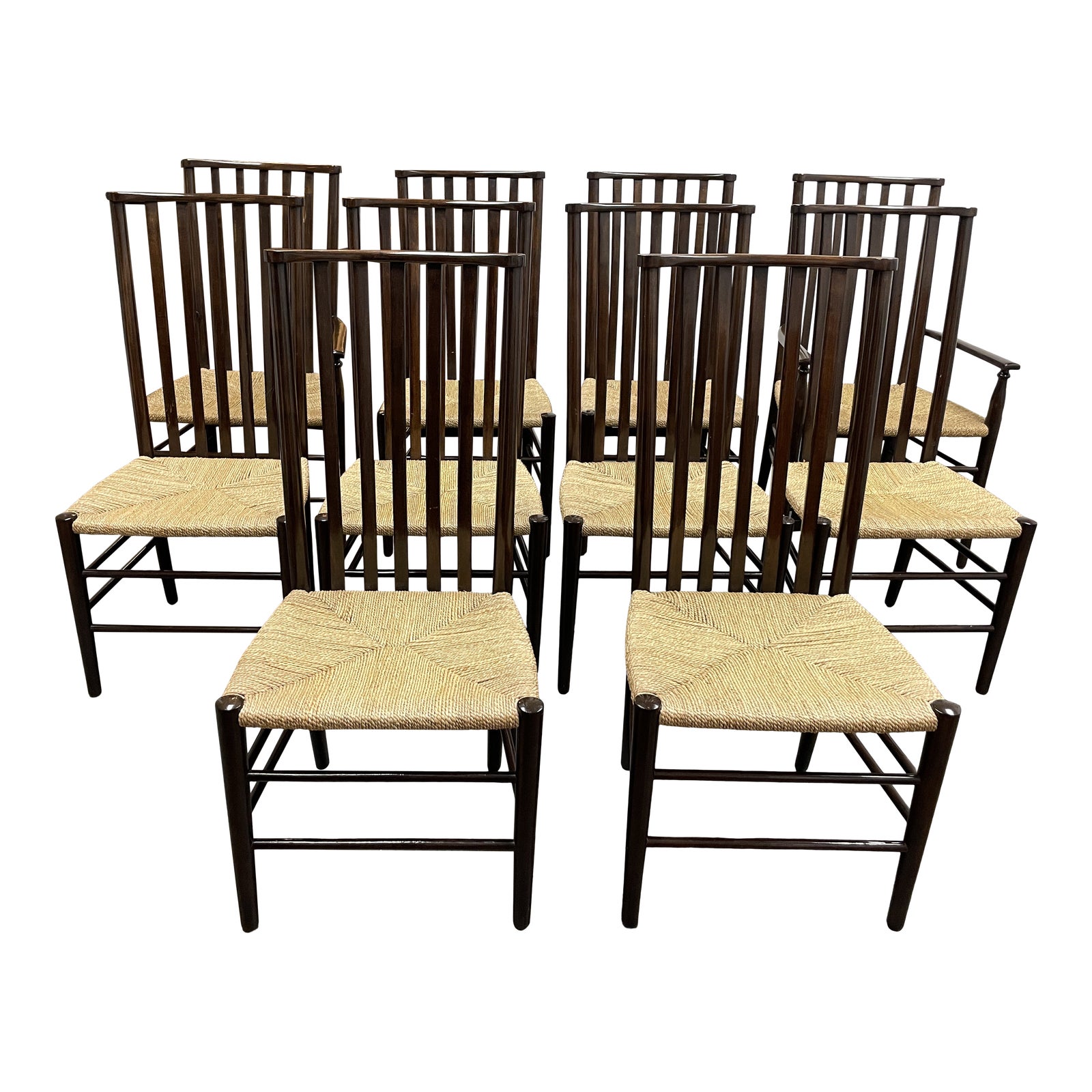 Design Plus Gallery presents a Set of Ten Hackwood Dining Chairs by Dessin Fournir. Eight side and two stunning arm chairs, beautifully crafted of solid walnut with subtle turned and curved details. The graphic seating has naturally contrasting rush seats to charming effect. Original removable seat cushions have conditions. Can be used with or without.