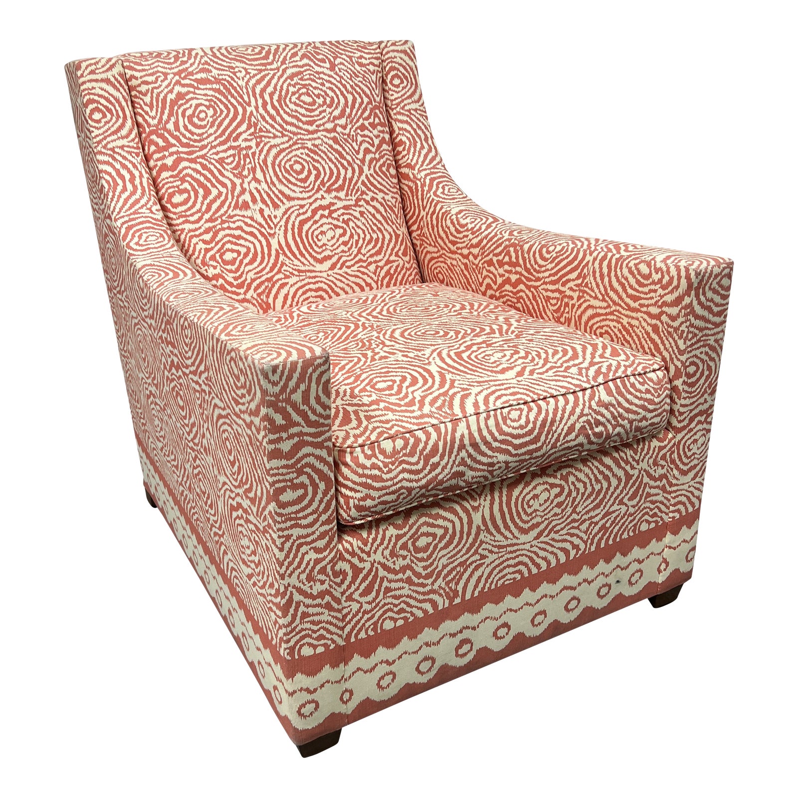 Design Plus Gallery presents a Coral Club Chair by Dessin Fournir. From the exclusive Kendall Wilkinson Interior Design Collection. Sexy swirled coral tiger print with a lovely tribal banded border cotton linen fabric. Wonderfully comfortable proportions on this unique chair, in good showroom like condition. Visible wear from usage + black marking on skirt. This is a discontinued model.