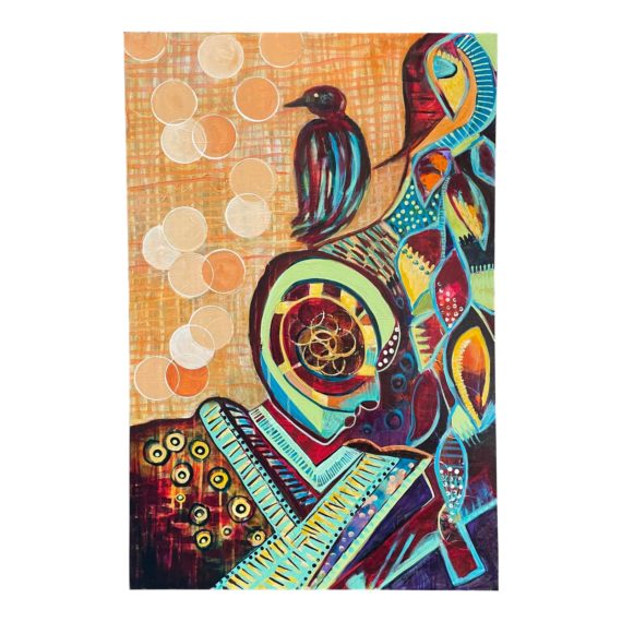 Design Plus Gallery presents Cosmic Crusader, an original painting by Diane Sherman. The dynamic acrylic painting flora, fauna, forms and furnishings in a moment of color.