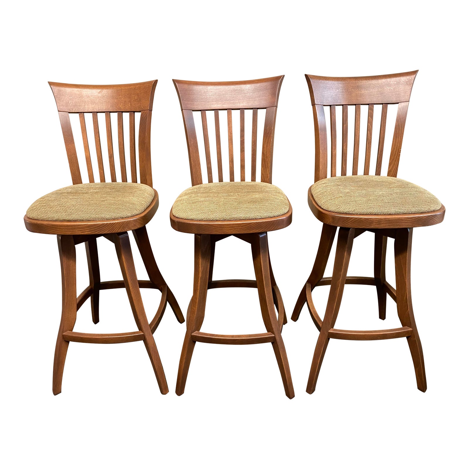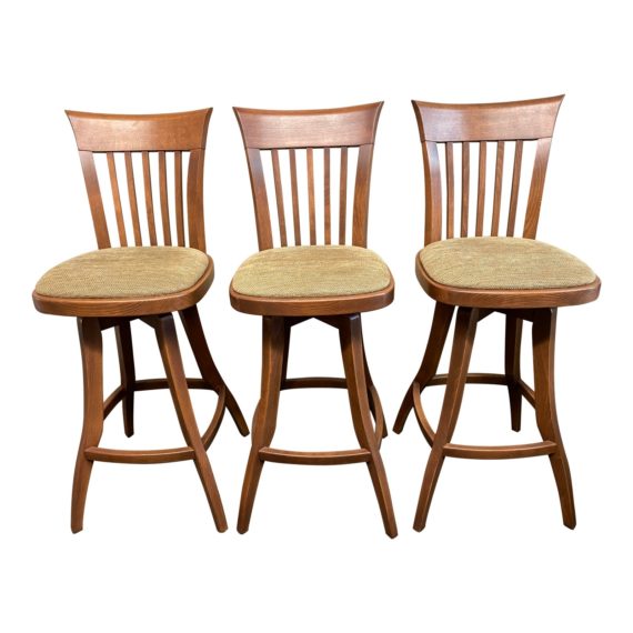 Design Plus Gallery presents a Set of Three Swivel Barstools by Dinec. Solid birch, with a warm medium finish that lets the woodgrain show through, the bar height chairs employ a smooth swivel mechanism on the slat back seats. Cushioned seats are upholstered in a textured multicolor weave that “reads” muted gold from a distance.