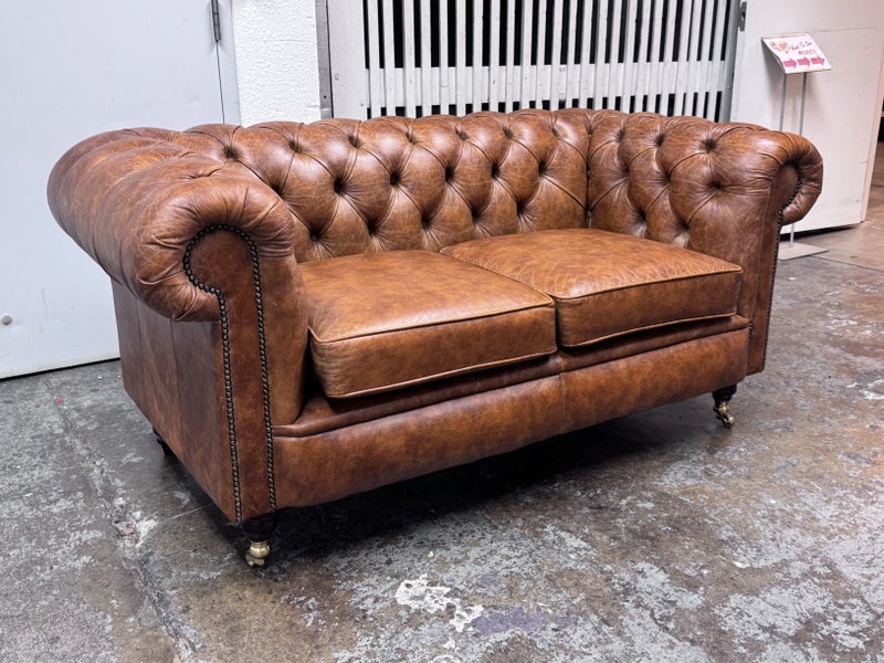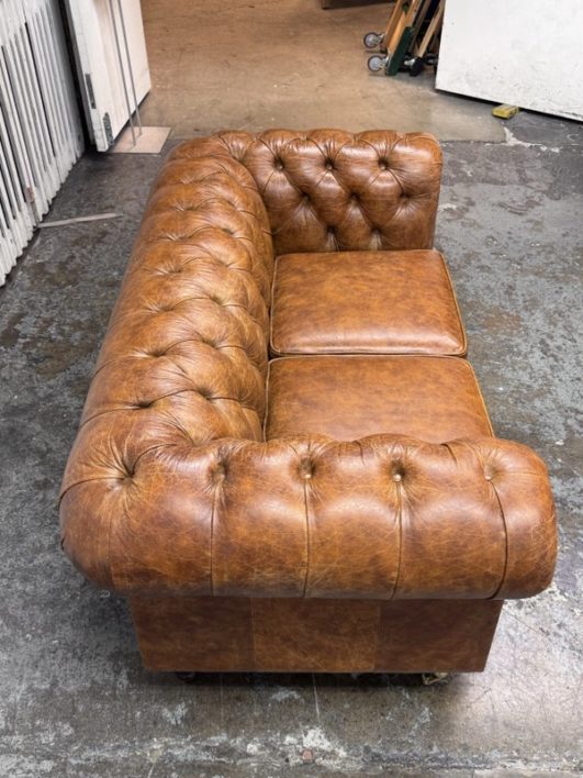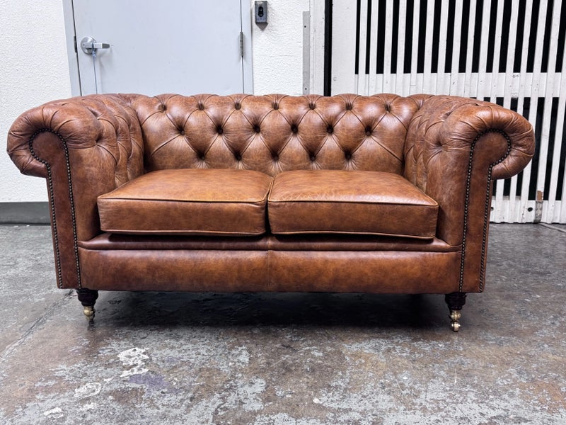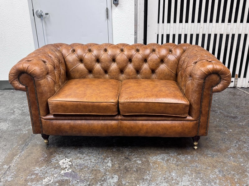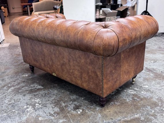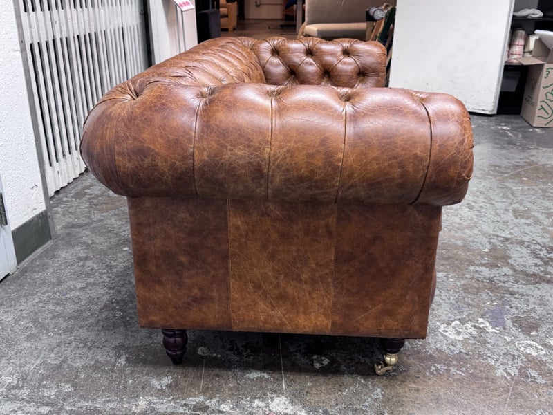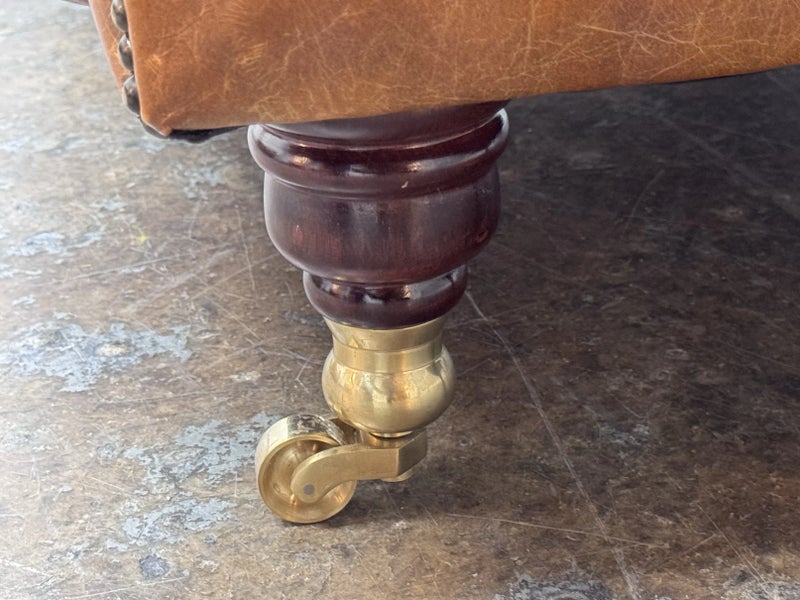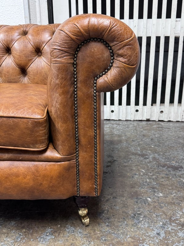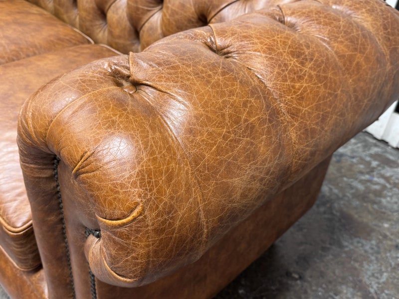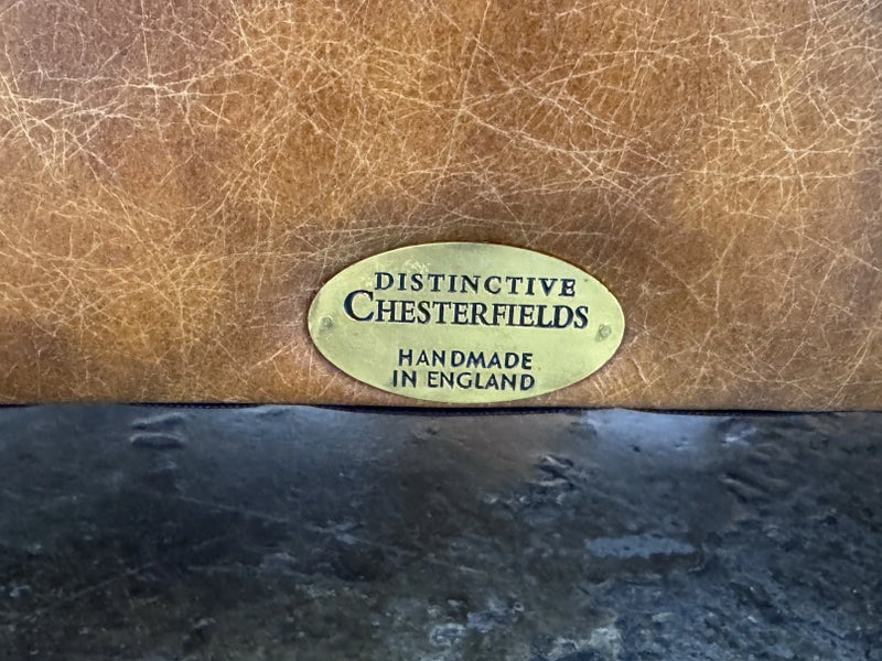 Design Plus Gallery presents the Belchamp Chesterfield Cracked Wax Tobacco Leather Tufted Sofa from Distinctive Chesterfields, England. The Belchamp boasts a deep buttoned back, traditional upright arms, and soft seat cushions. As a result, you can expect a comfortable, soft seat with additional cradling on the back.Belchamp combines a formal, distinguished look with a softer, yet surprisingly supportive sit. A single-buttoned border, with studded detailing and mahogany-stained feet, finished off with polished brass castors equip the Belchamp with all the hallmarks of a quality, crafted Chesterfield. Is in good condition with minor wear that is consistent with usage.