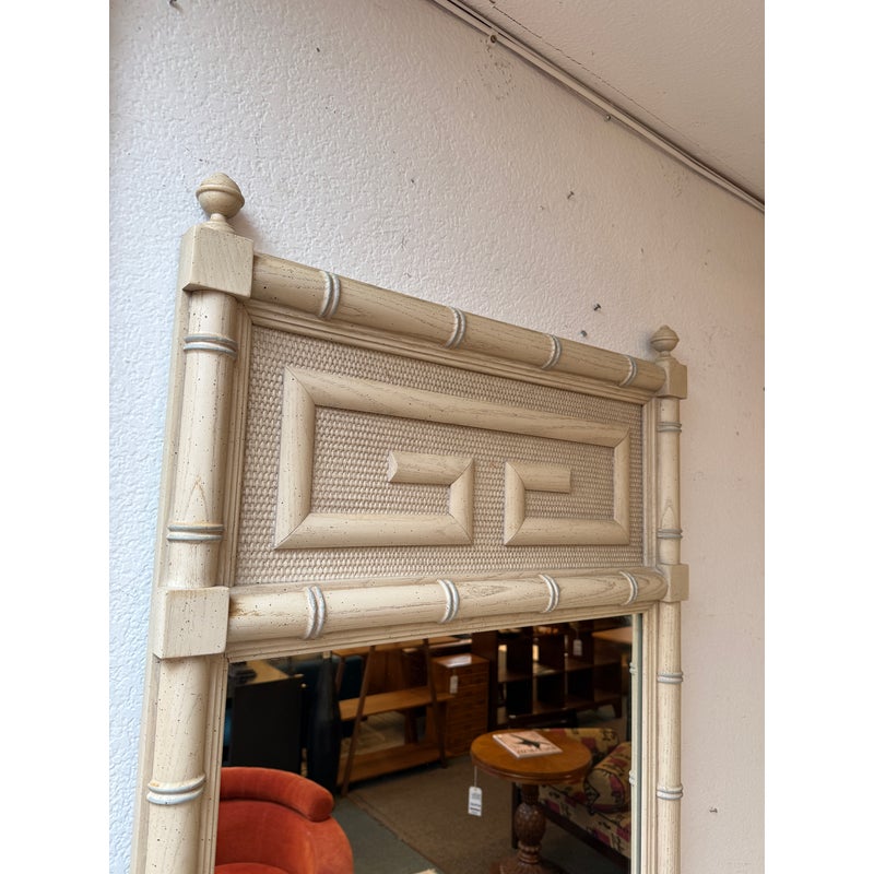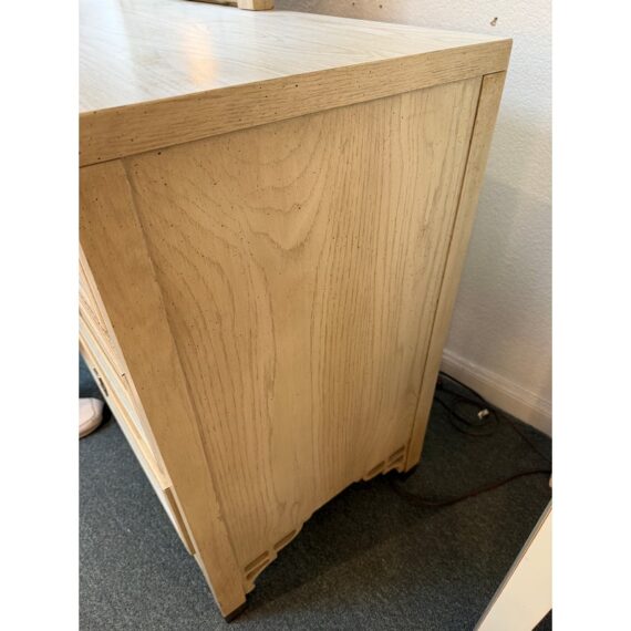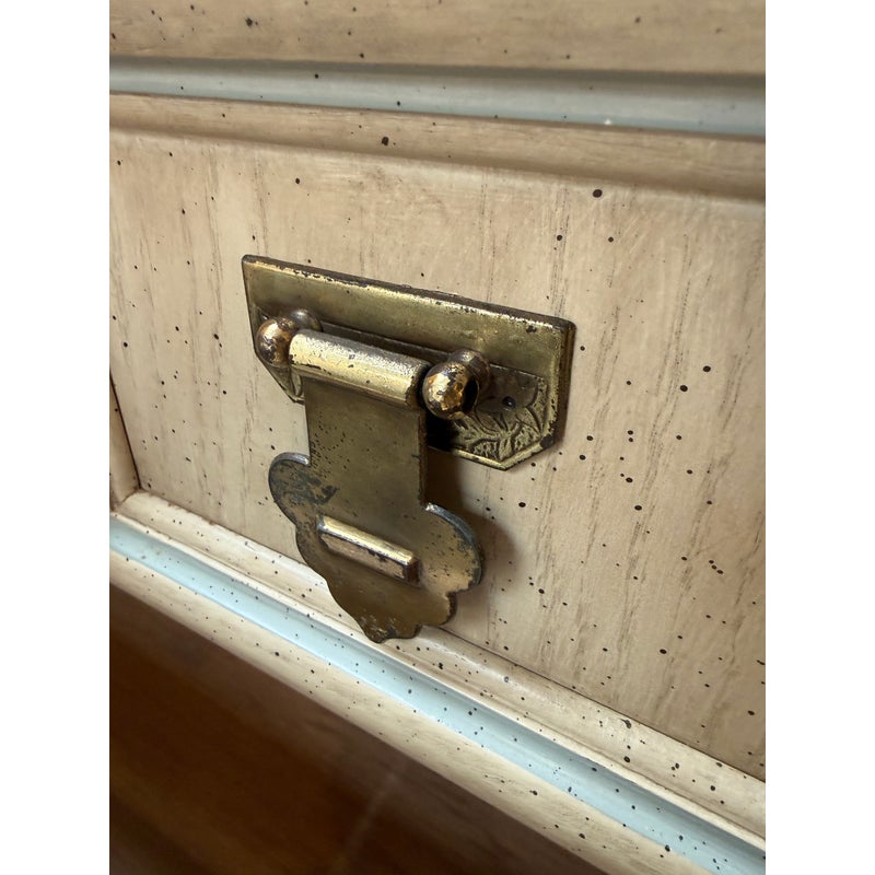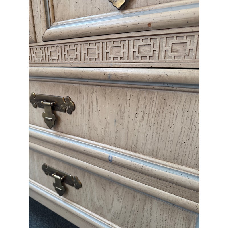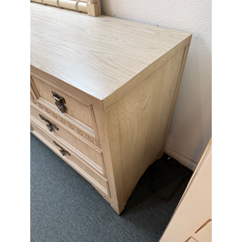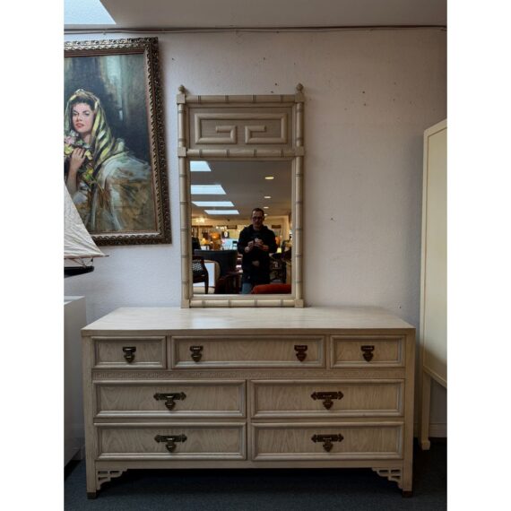 Design Plus Gallery presents the Shangri-La Chinoiserie Dresser + Mirror from Dixie Furniture. A standout piece blending Hollywood Regency glamour with Asian-inspired Chinoiserie style. It is made of quality woods with a delicate veneer, and has its original brass hardware. The configuration includes three smaller top drawers and two rows of two drawers beneath for a total of seven altogether. The accompanying mirror echoes the dresser’s motif, creating a sophisticated and cohesive look perfect for a bedroom, guest suite, or eclectic entryway. In good condition, visible and minimal wear from usage. Made in USA.
