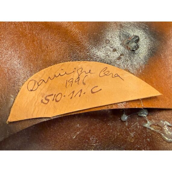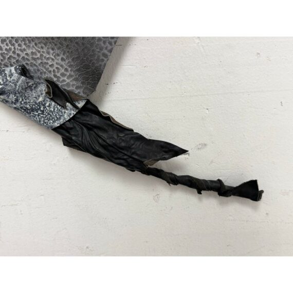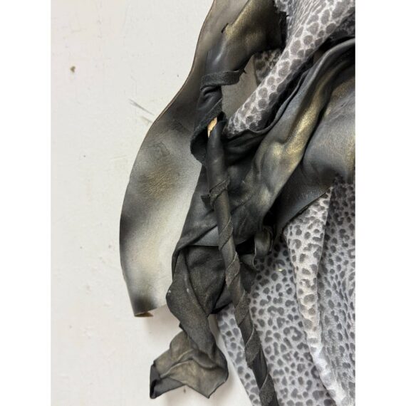 Design Plus Gallery presents a Handmade Leather Art Mask from Dominique Caron. This one-of-a-kind abstract sculptural work is composed of leather, cloth, and mixed media, with a concealed mask form framed by layered draped elements and an elongated silhouette. A palette of gray, black, ivory, and muted gold gives the piece a moody tonal range, while the folded materials and painted surfaces reflect the artist’s travel inspired approach. Part of a broader body of work informed by cultures in Africa, the mask carries a dramatic, enigmatic presence. It is in good condition with visible and minimal wear from usage. Signed 1996.