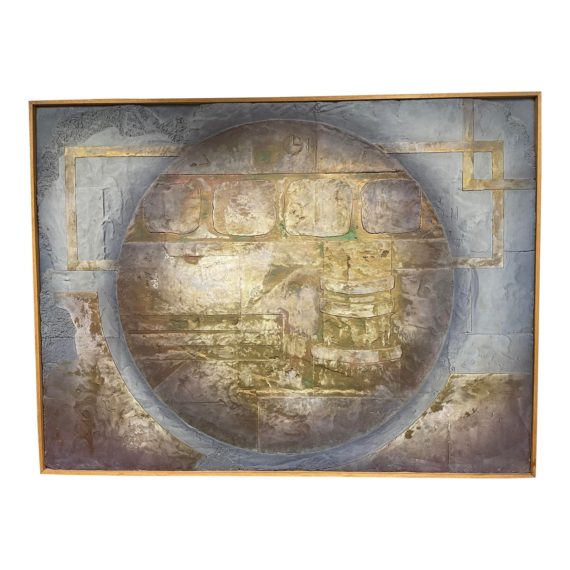 Design Plus Gallery presents a Don C. Nix” Voices in the Wind” Mixed Media Painting. Plaster and clay are mixed with paint in a large scale configuration with architectural detailing within an orb aura. Painted in 1980 on wood panel, with a variety of cool neutrals and bronze pigment. Artist’s bio is attached on the back. Minor wear, painting is in good condition.