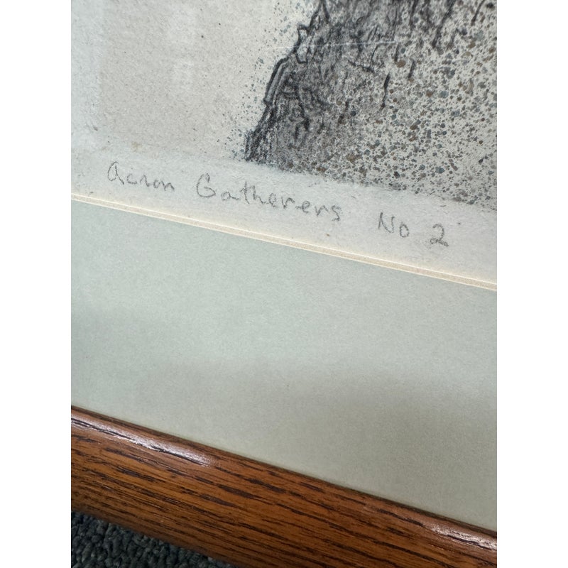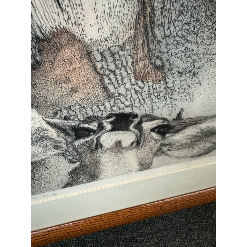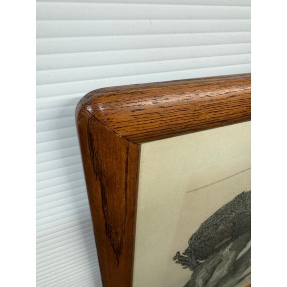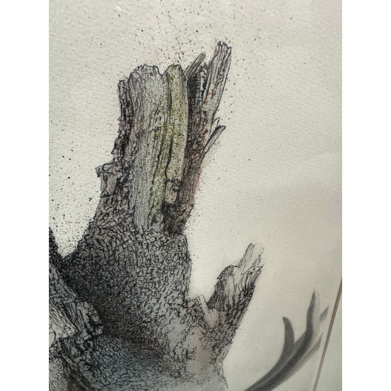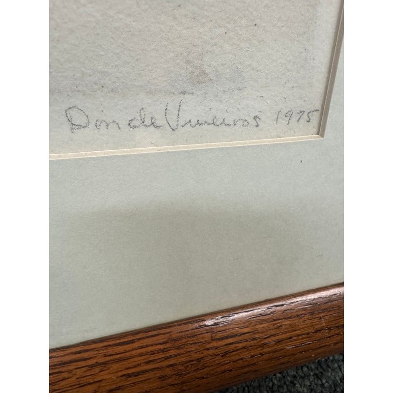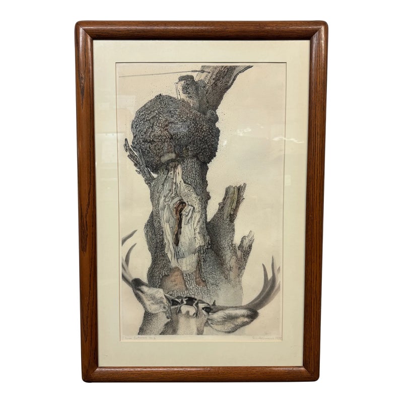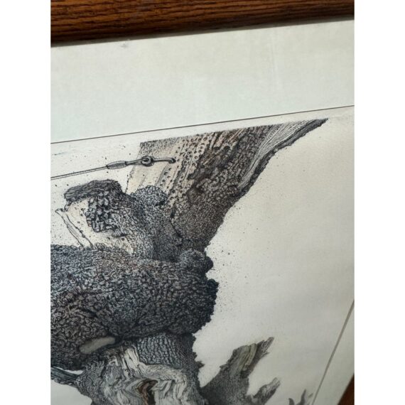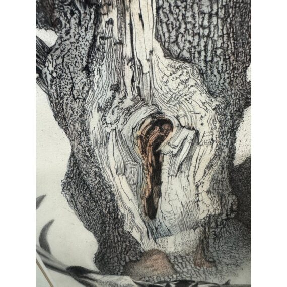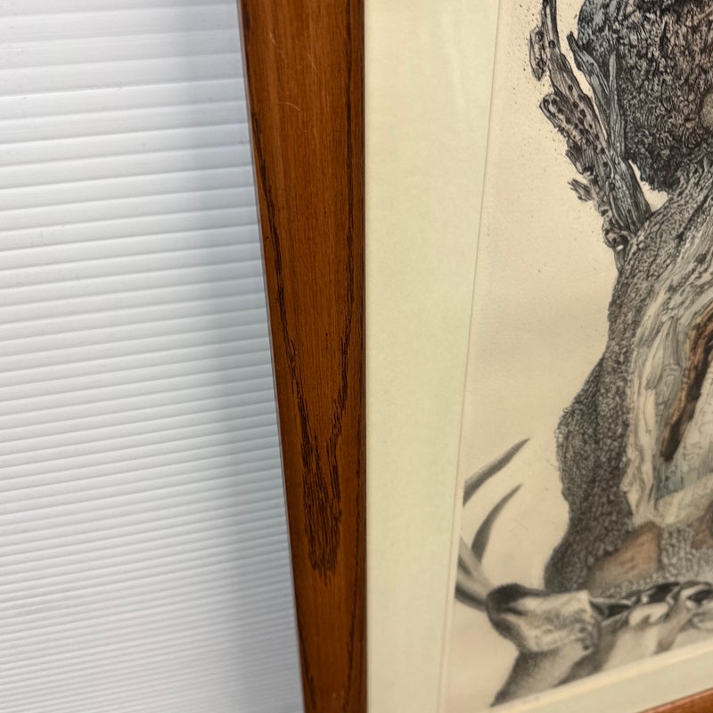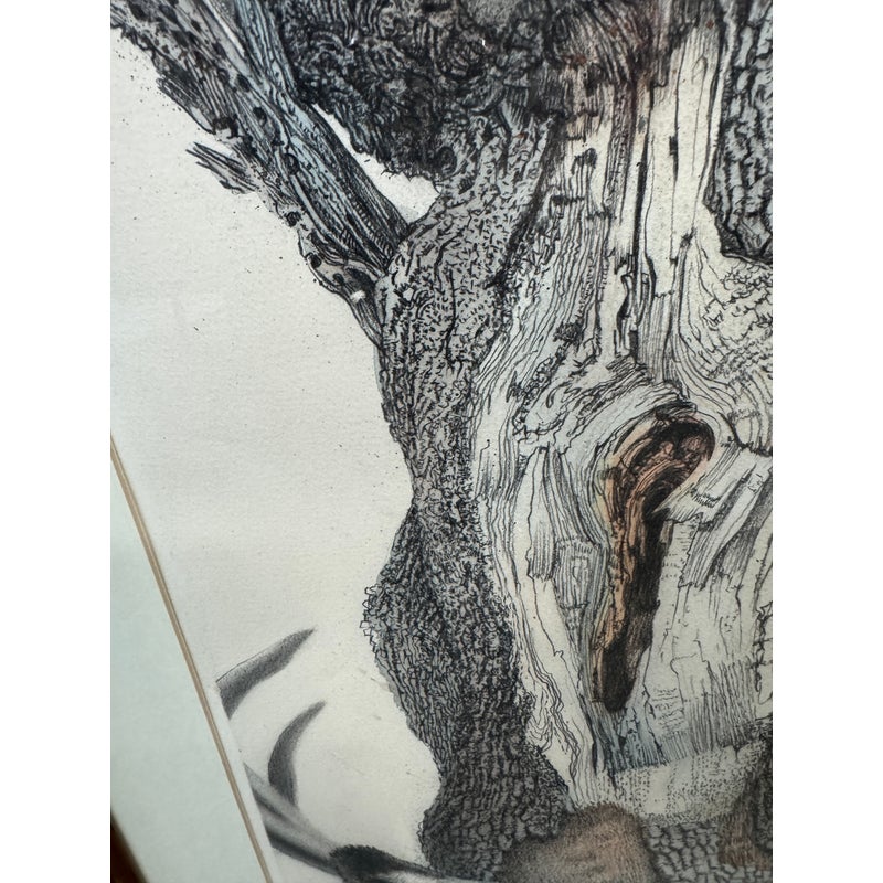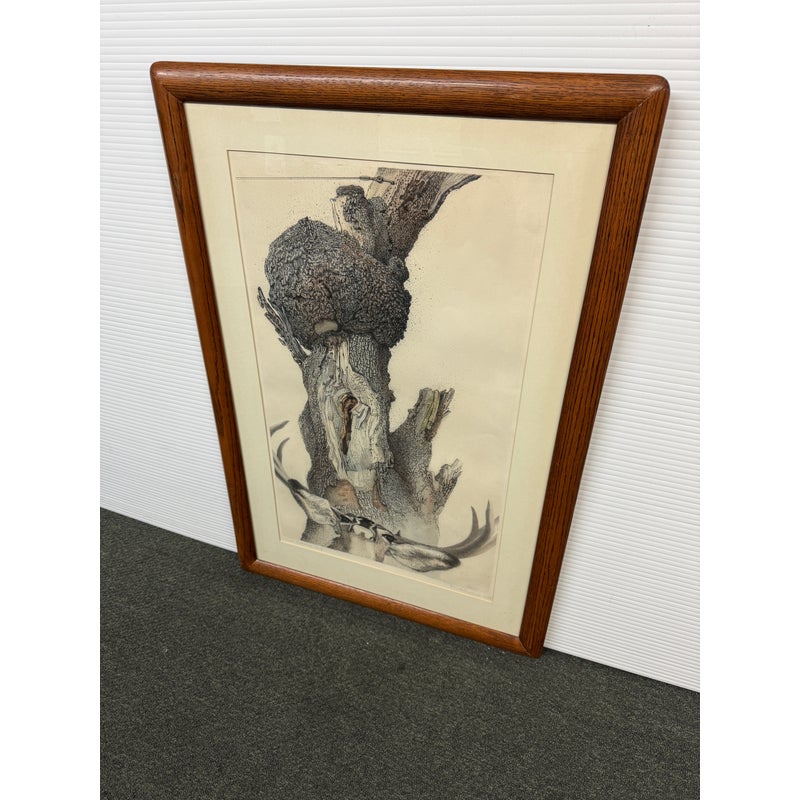 Design Plus Gallery presents a stunning Pen & Ink Drawing by Don De Vivieiros, 1972. Titled “Acorn Gatherer No.2” featuring a curious woodland creature, large drawing pulls our gaze upward over the rough and weathered trunk of an oak tree. Colored ever so slightly, the detail is incredible to review. Professionally matted in ivory; 1970’s rounded solid oak (naturally) framing; protected by glass. Condition is good for age and use.