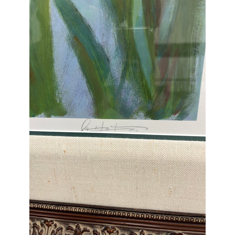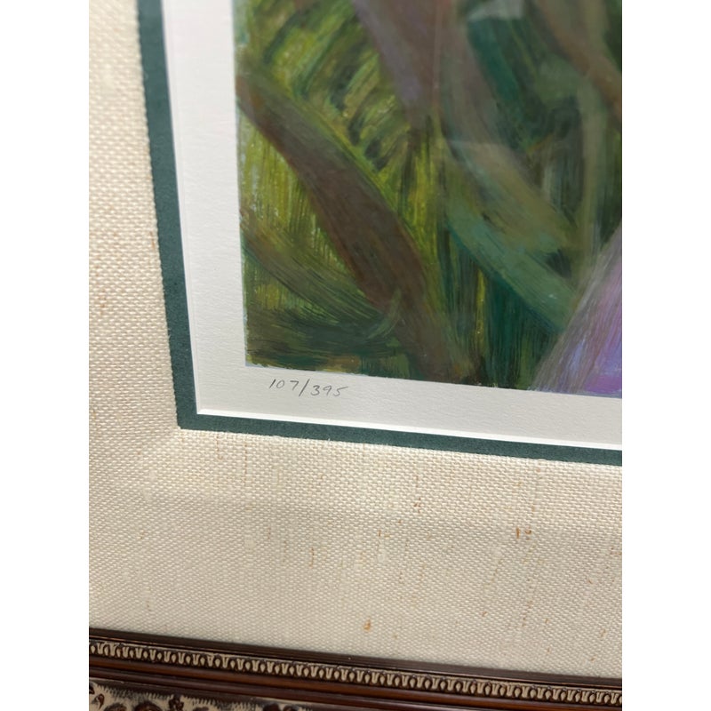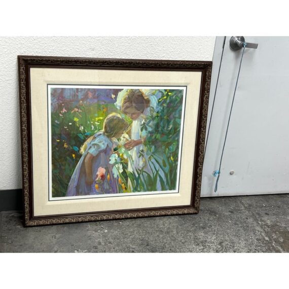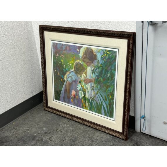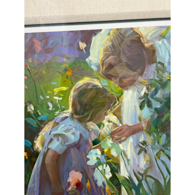 Design Plus Gallery presents a “Sweet Scents” by artist Don Hatfield. A tender, light-filled depiction of a mother and daughter sharing a quiet moment in a garden. Known for his ability to capture intimate family scenes, Hatfield employs a soft palette and gentle brushwork that emphasize warmth, affection, and the fleeting beauty of everyday life. The impressionistic style allows light and color to convey emotion, drawing the viewer into a serene, timeless atmosphere. This work is hand-signed by the artist and is edition number 107 of 395, adding to its collectibility. In good vintage condition, visible and minimal wear from usage.