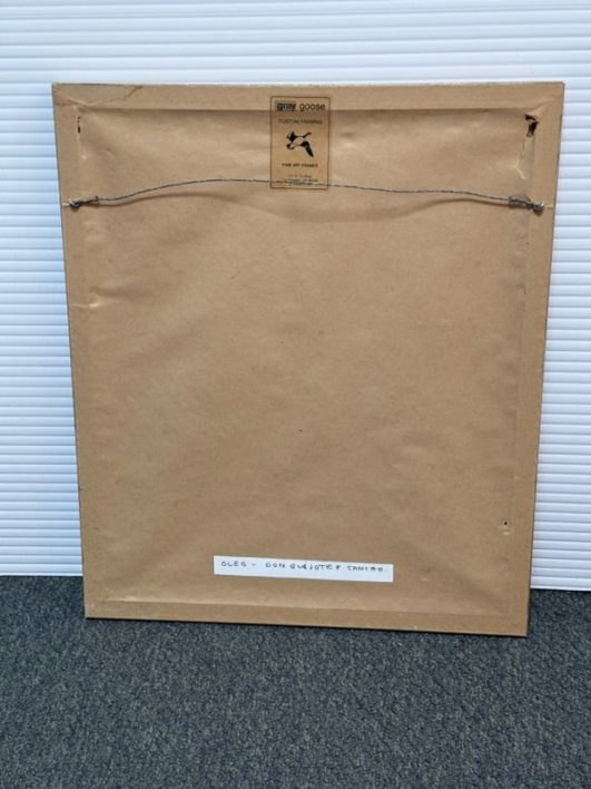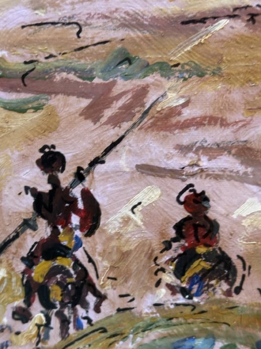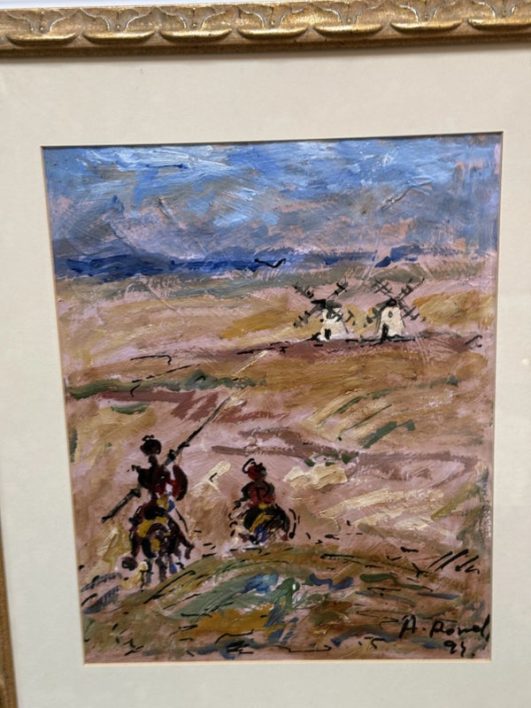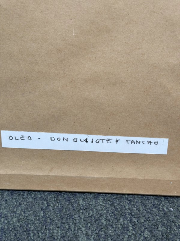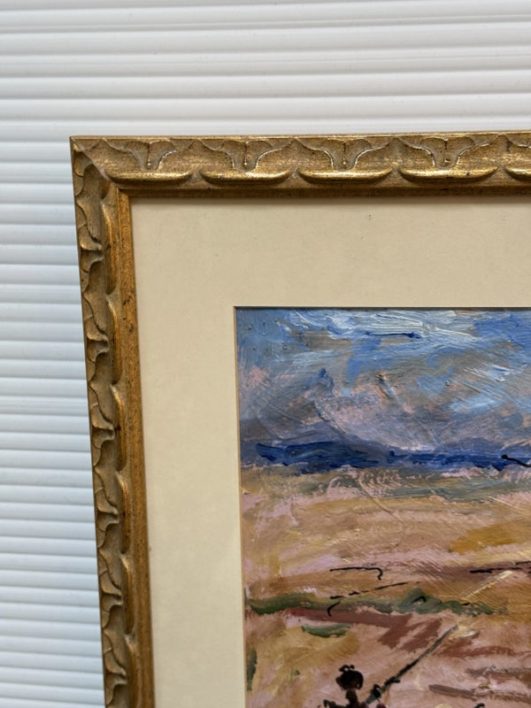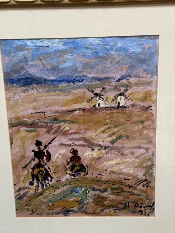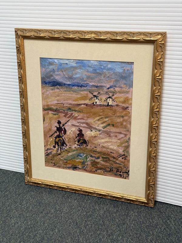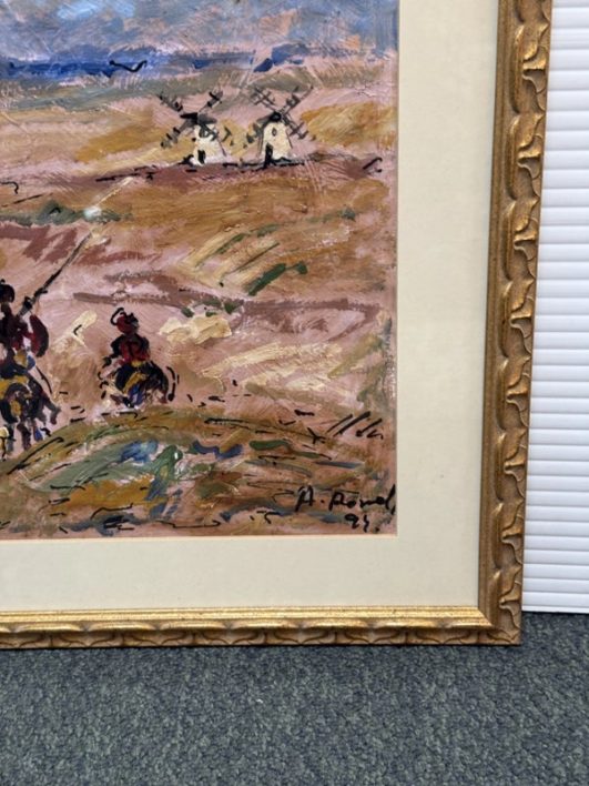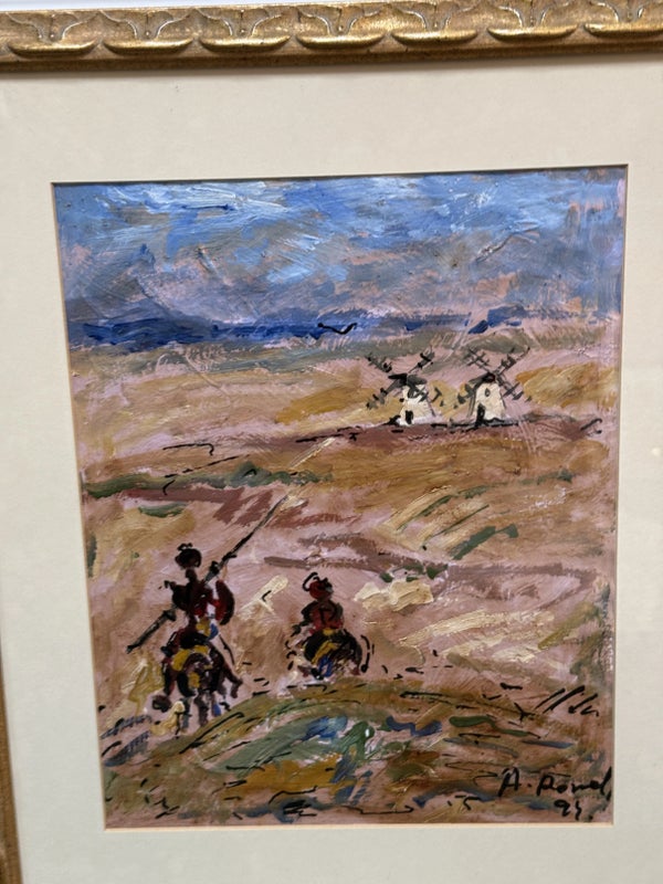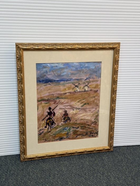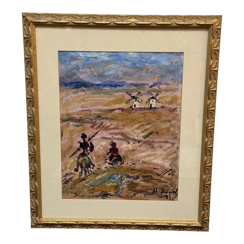 Design Plus Gallery presents an Original Signed Painting featuring Don Quixote and Sancho Panza. On his horse, Rocinante, a beast well past his prime, Don Quixote rides the roads of Spain in search of glory and grand adventure. Here, he sets out on his second adventure along with a befuddled laborer named Sancho Panza, whom he has persuaded to accompany him as his faithful squire. Wonderful depth and color, signed in lower right by artist, c.1993. Little evidence of wear; condition is good for age and use.