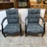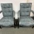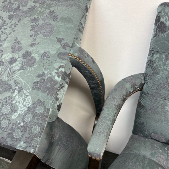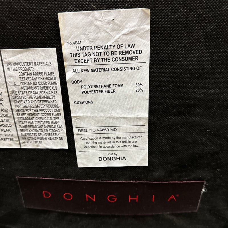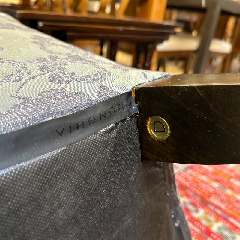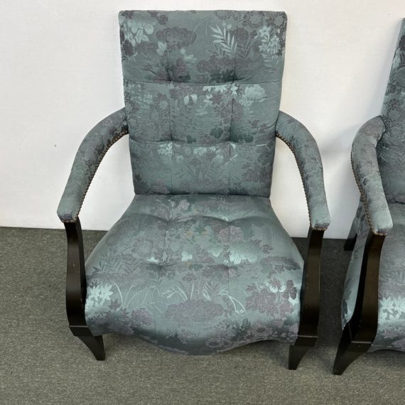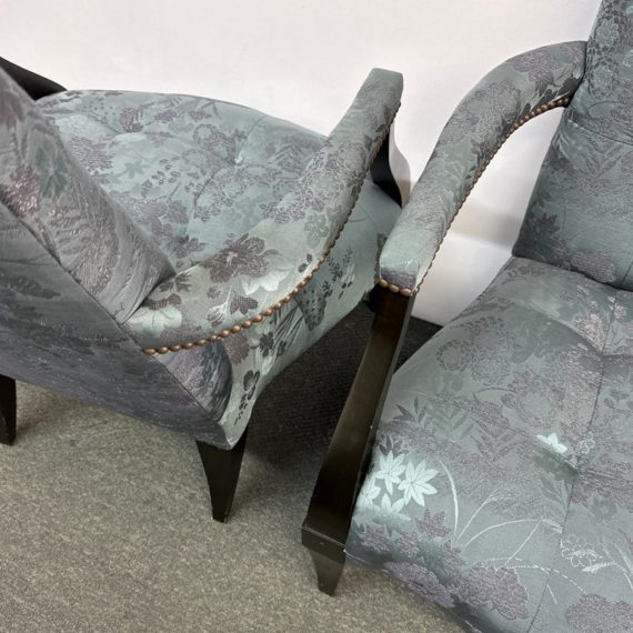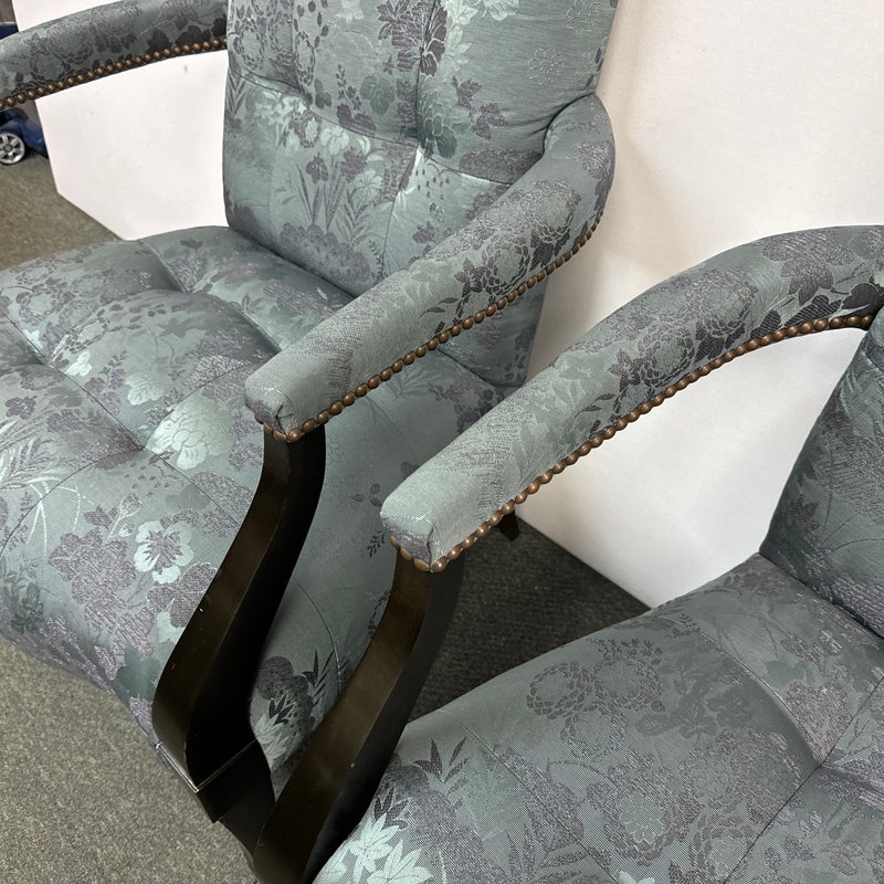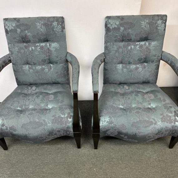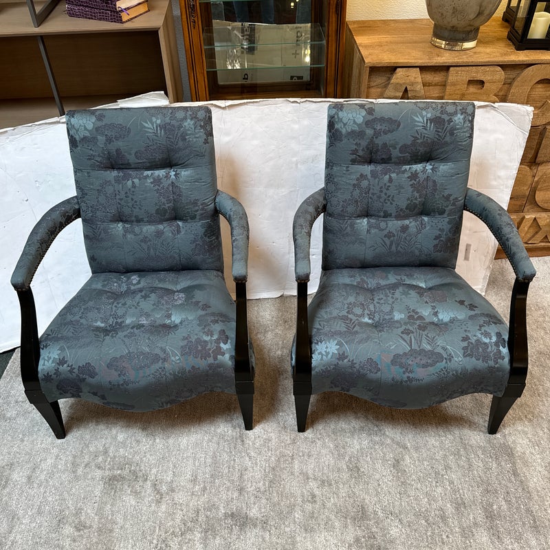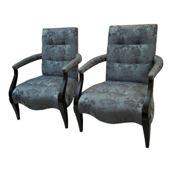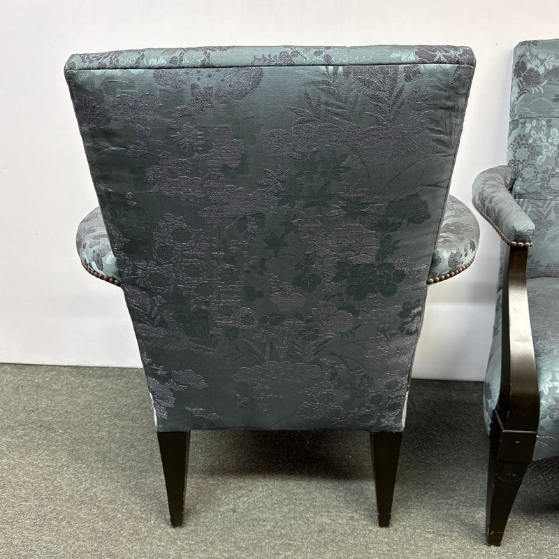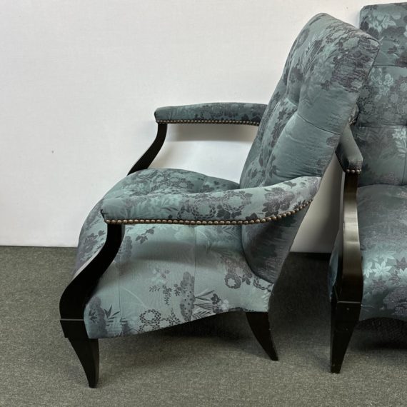 Design Plus Gallery presents a Custom Pair of Arm Chairs by Donghia. Luxurious two tone Rubelli upholstery features a delicate floral jacquard pattern. Deep cushioning, with tufting, create an inviting and comfortable pair of seats. Detailed with black stained wood arms and tapered legs. Light surface wear on wood; condition is good for age and use.