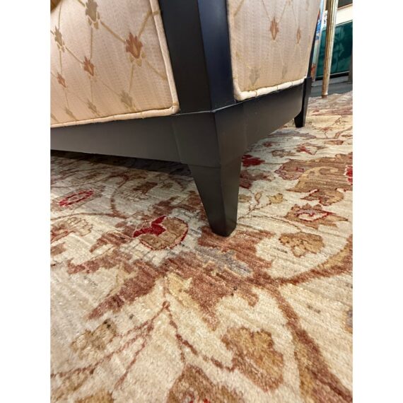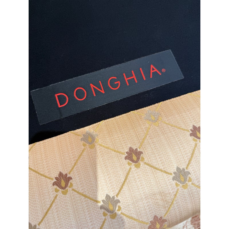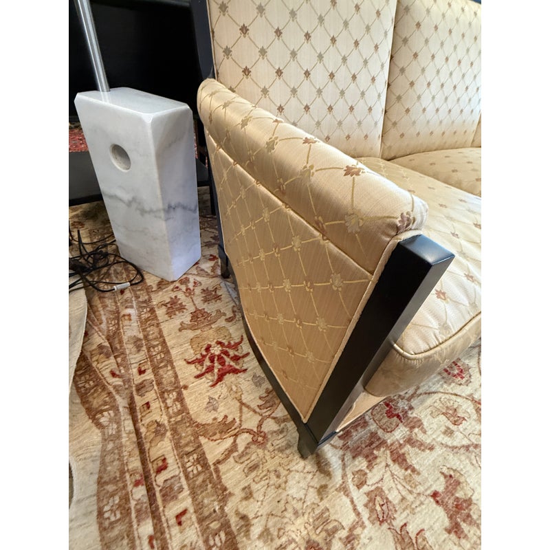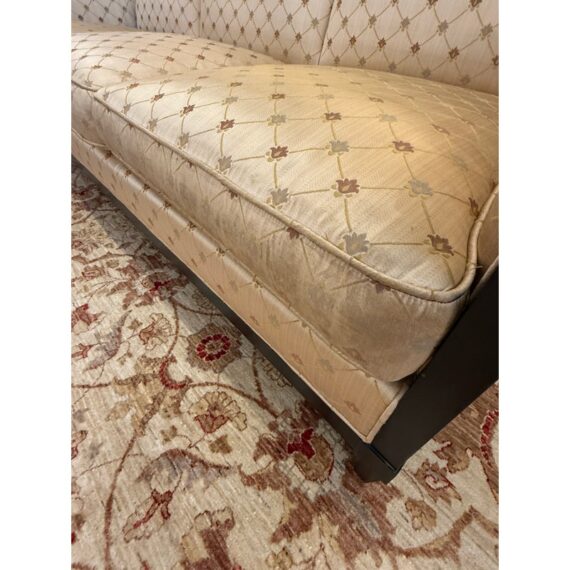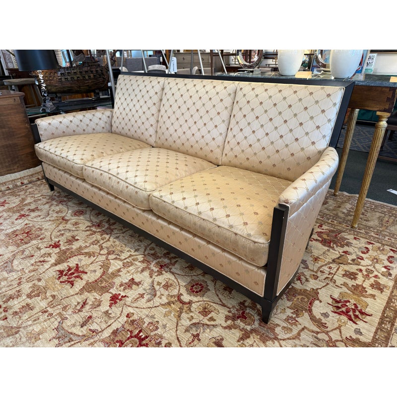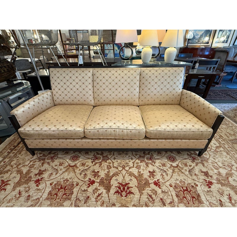 Design Plus Gallery presents a Sofa from Donghia. Upholstered in a champagne satin with a lattice of stylized floral motifs, this three seat sofa pairs an angular wood frame with an architectural profile. Sloped sides, tapered legs, and three loose seat cushions give the silhouette a tailored look, while the high back and generous proportions add balance to the overall form. The Donghia label is present. It is in good condition with visible fabric and frame wear from usage. Made in the USA.
