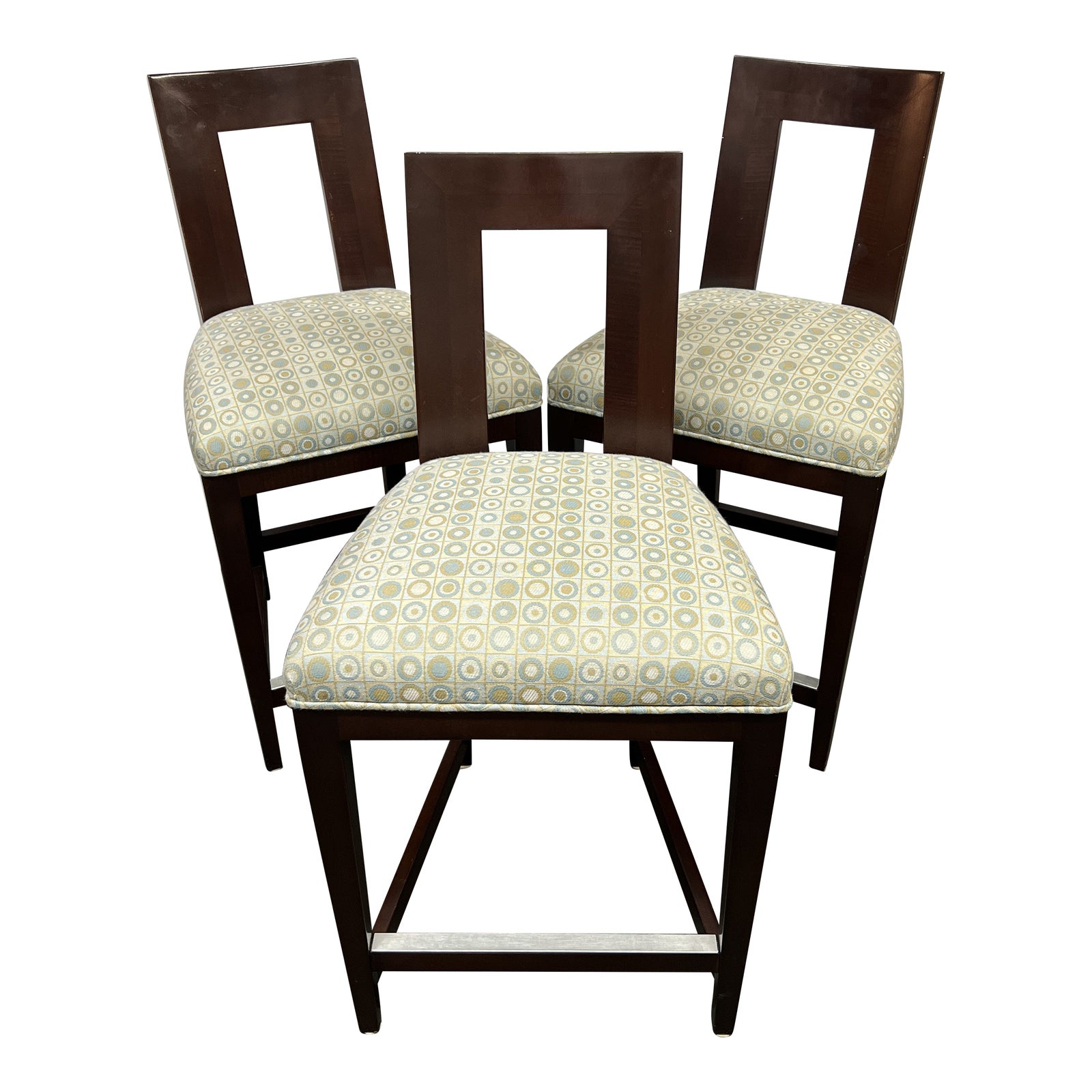 Design Plus Gallery presents a Trio of Margarita Counter stools by Donghia. This boldly graphic set is iconic Donghia. Luxurious comfort with contemporary styling. Rich dark wood frame with open waist is protected with brushed footrests. Citrus + blue circles and squares jacquard fabric cover the cushioned seats (recently redone). Light surface scratches, otherwise good condition.