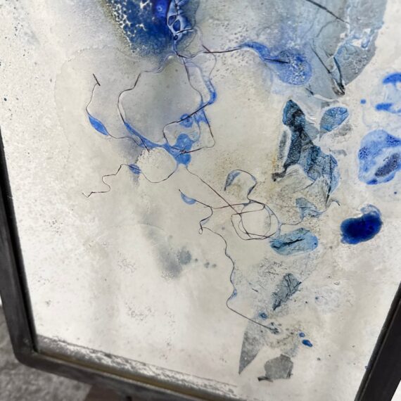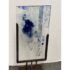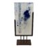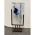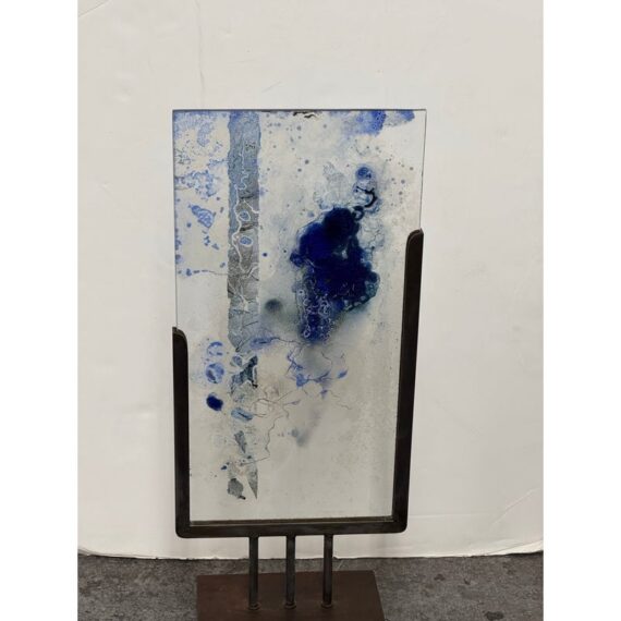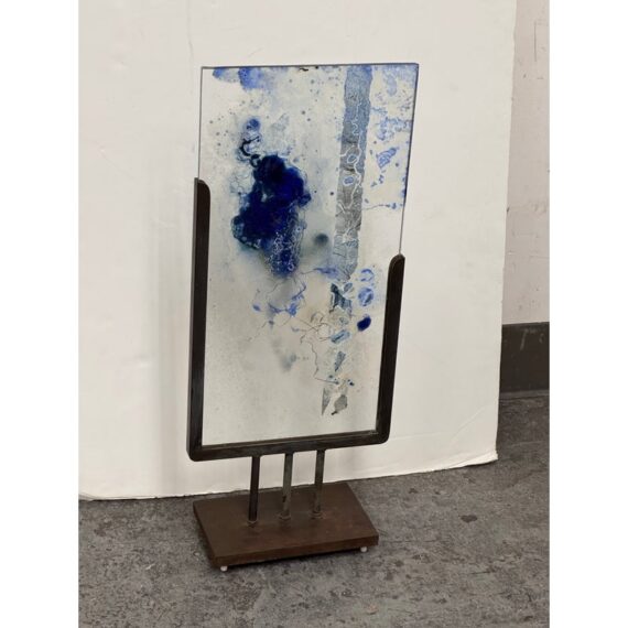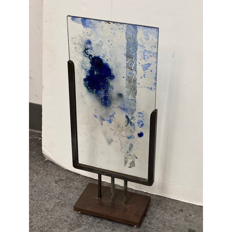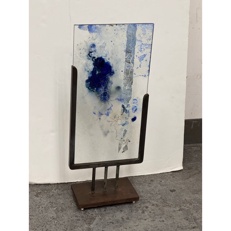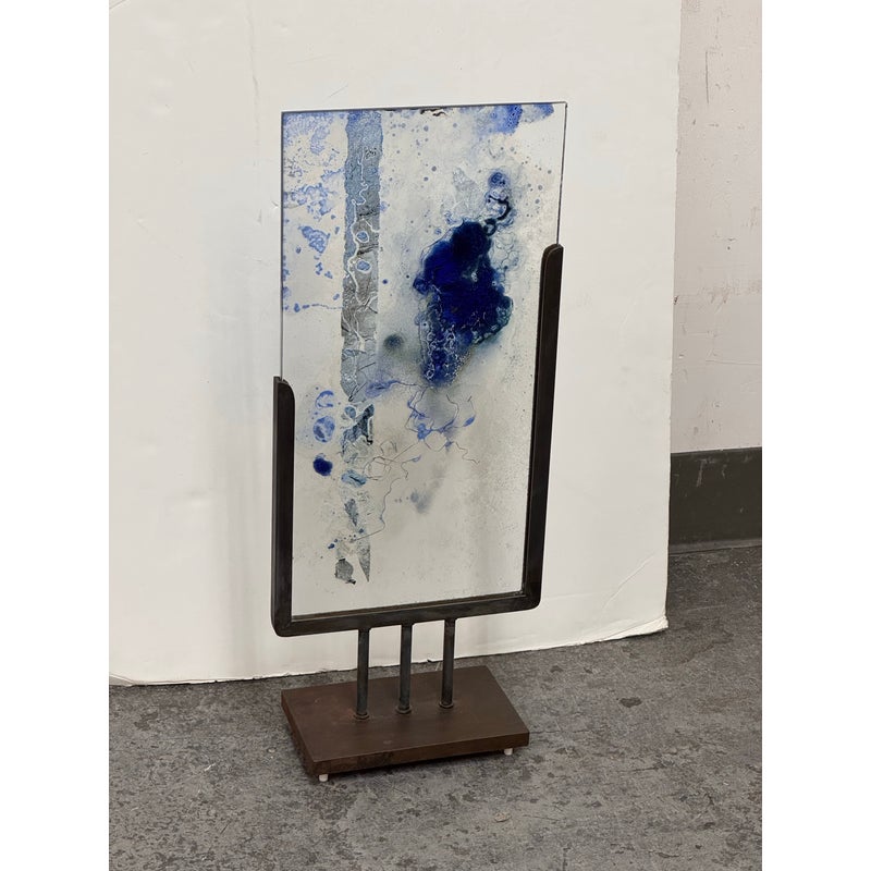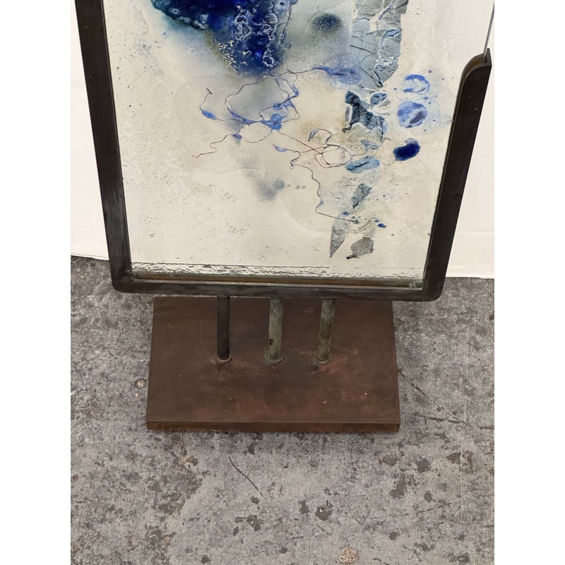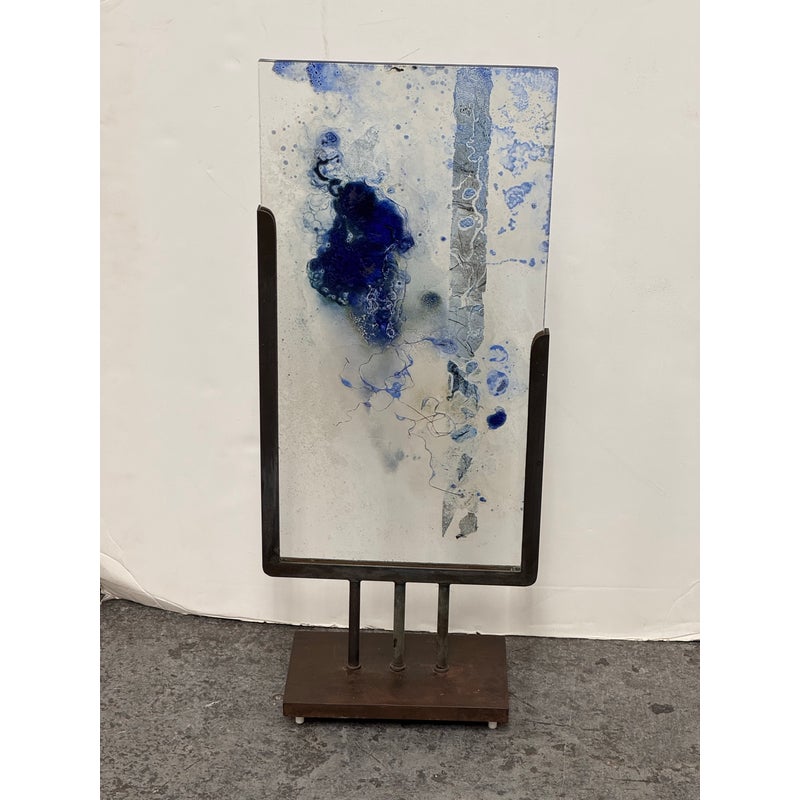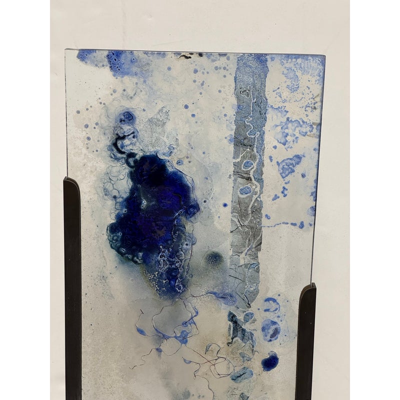 Design Plus Gallery presents “Dispersed With Calilgraphy” by Donna Hunt. This sculptural work pairs a vertically oriented glass panel with an architectural metal stand. The glass composition showcases layered blues, soft neutrals, and organic markings that resemble ink movement and handwritten gestures suspended within the surface. Variations in opacity and texture give the piece depth, encouraging light to interact differently from every angle. The metal stand has a geometric base and allows the glass to be viewed at the front and back angles. The materials create a balanced dialogue between fluid artistry and industrial form. It is in good condition with visible and minimal wear from usage. Made in the USA.