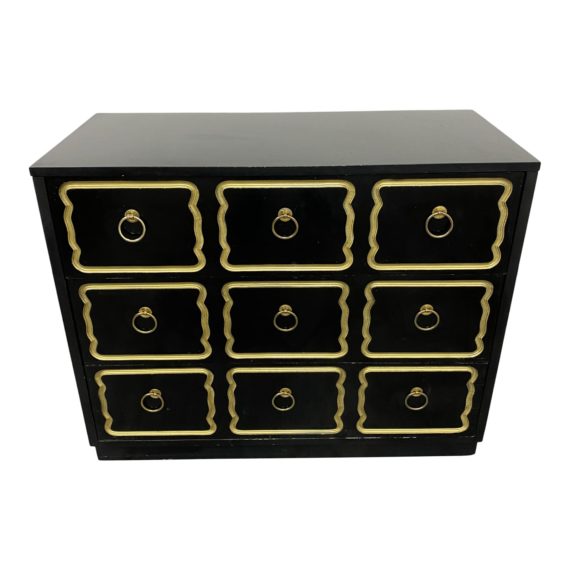 Design Plus Gallery presents a Dorothy Draper “Espana” Chest of Drawers. Lacquered wood with scalloped gilt decoration and brass hardware. Visible wear on the lacquer (pictured.) Chest epitomizes Hollywood Regency style and draws inspiration from Dorothy Draper’s travels to Spain. Plinth base supports three drawers of equal size.
