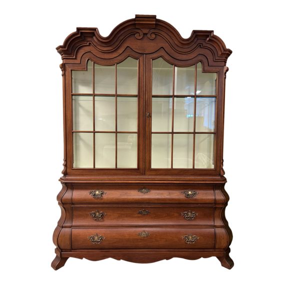 Design Plus Gallery presents a Dorothy Draper for Henredon Viennese Collection Display Cabinet. Impeccably constructed in the Late 20th century the two-part form is made of mahogany and antiqued. Design includes a French Provincial molded cornice, two hinged glazed doors, painted shelf interior, with mirrored back, glass sides, + three expansive drawers for concealed storage. Hardware is designed after that of an antique with oiled brass. There is minor wear through out, cabinet is in good condition. Silhouette has a lovely curved bombé form. Made by the Turner Family Collection in Wilmington North Carolina, USA.