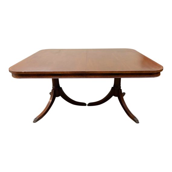 Design Plus Gallery presents a Drexel Heritage double pedestal mahogany rounded extension table. Table has an elegant thin contrasting inlay around the perimeter. Pedestal bases each consist of three feet with brass plates. Comes with three leaves.