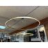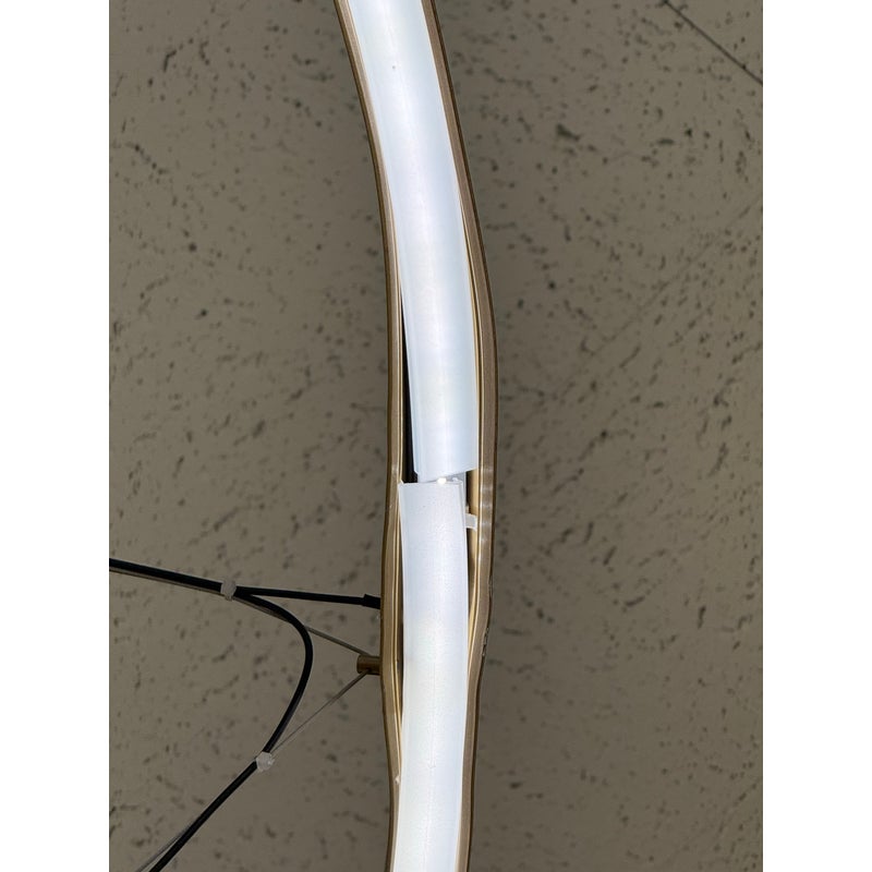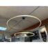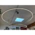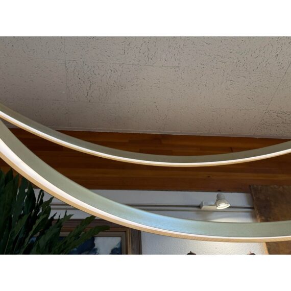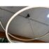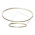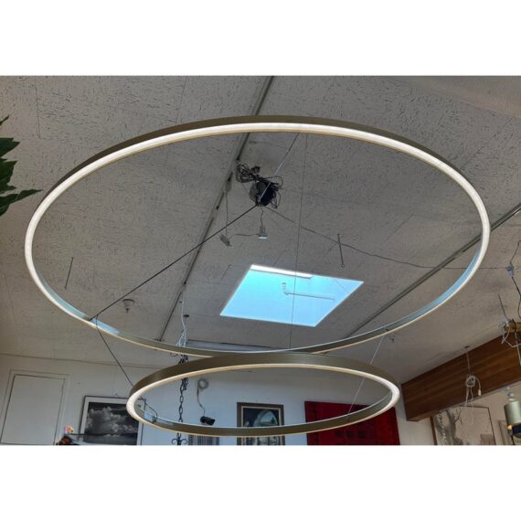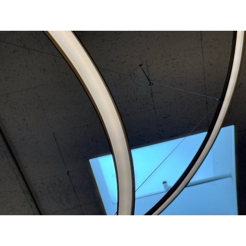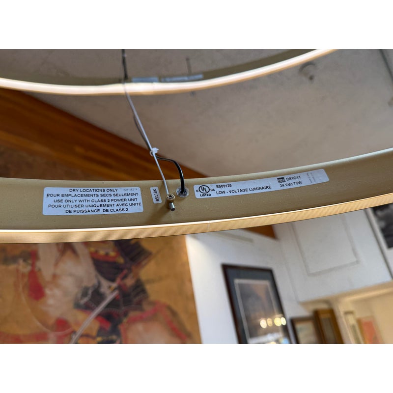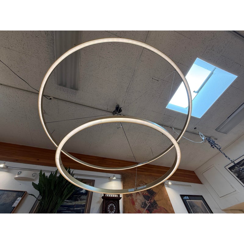 Design Plus Gallery presents a Pendant Light with Double Rings. The ultra-modern pendant has two circles that hang from its central canopy from barely visible strings that make the rings seem as if they are floating in air. The rings have a golden metallic tone with integrated LED lighting on its underside. The pendant has general wear with a slight break in one of the rings and the LED is starting to dim. It is in fair condition.